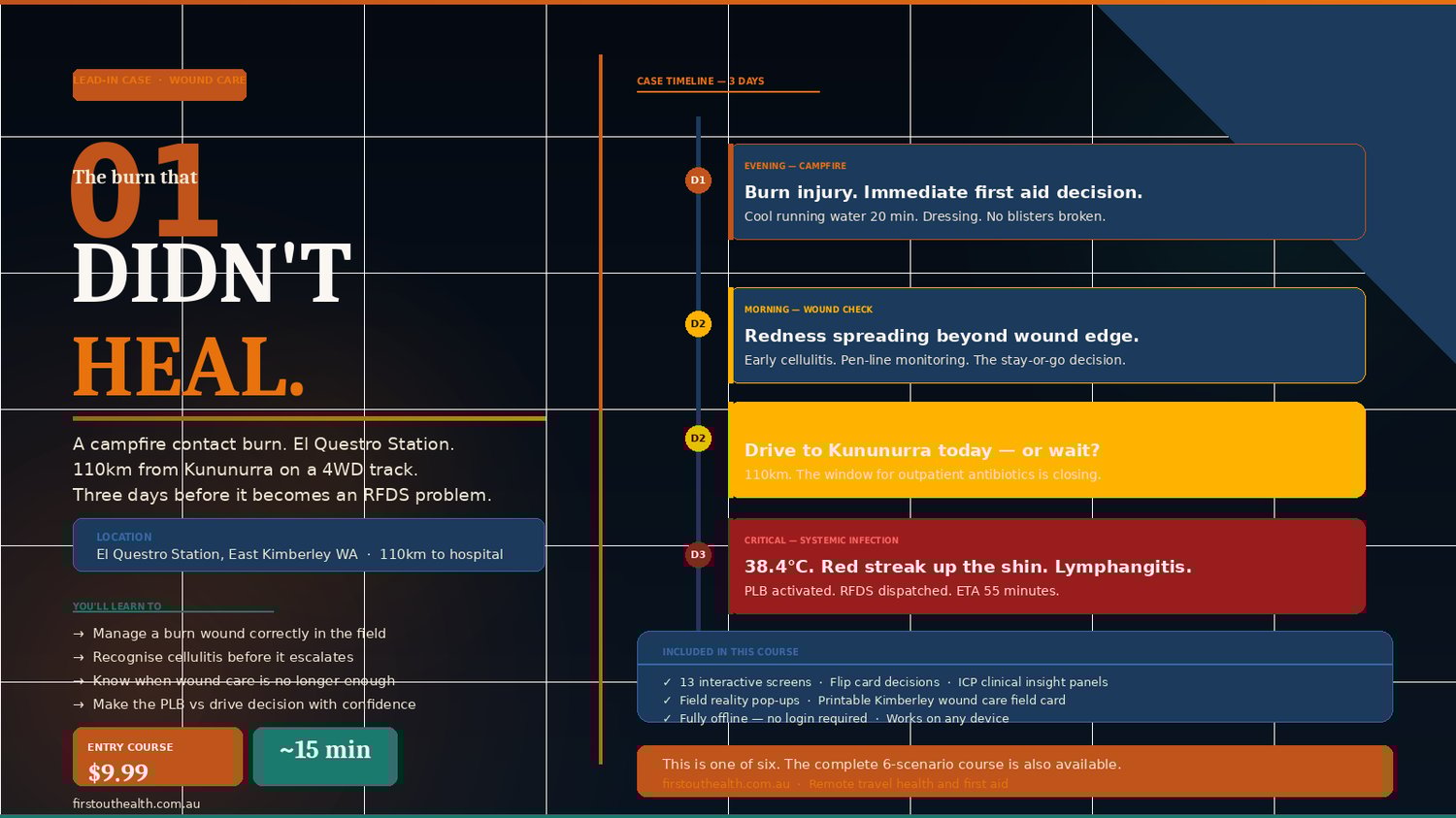 This is the First Out Health lead-in course — a single case study that runs you through one of the most common and preventable remote health failures in Australian travel: a minor burn that wasn't managed correctly in the field, became infected, and escalated into a systemic infection requiring evacuation.