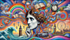 A surrealistic caricature of Virginia Woolf, celebrated English modernist writer, illustrated with expressive eyes and exaggerated thoughtful features. Woolf’s colorful, swirling hair embodies her famous literary technique of stream of consciousness, interwoven with symbolic imagery such as floating pages, seashells, clocks, and ocean waves. The dreamy backdrop merges surreal representations of early 20th-century London landmarks with maritime elements, creating an imaginative tribute to her introspective literary universe.