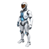 - A modern robotic design with white and blue armor panels and a streamlined helmet