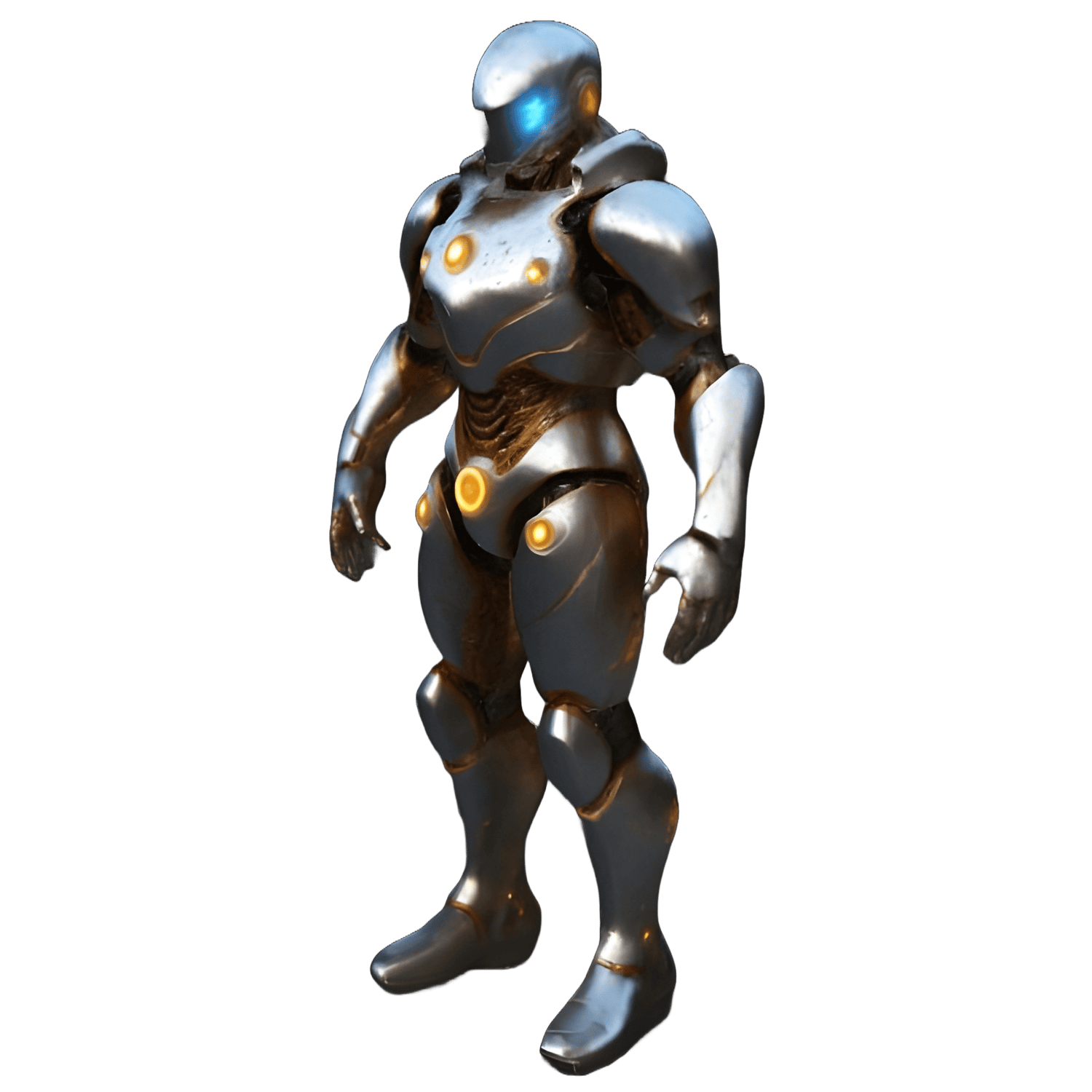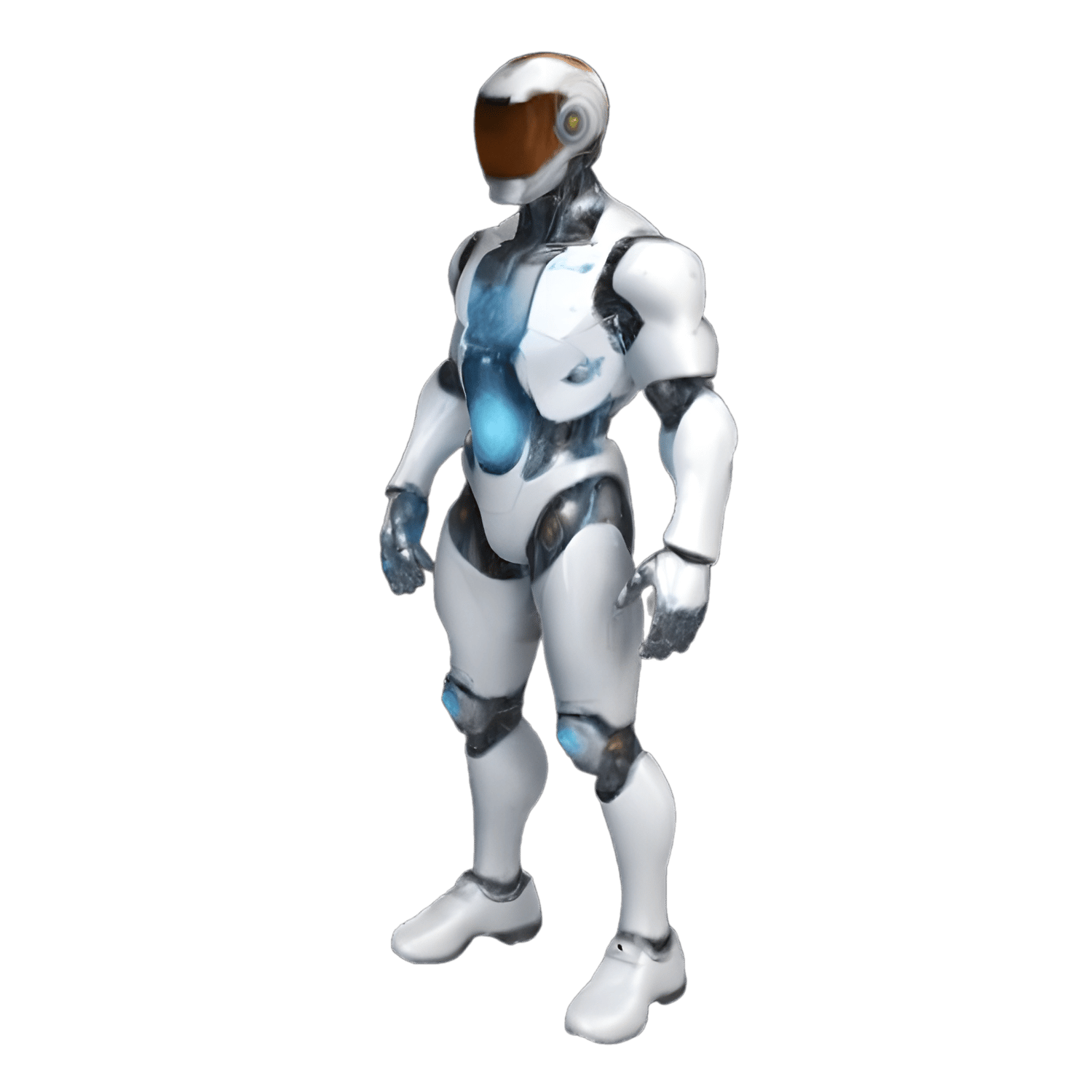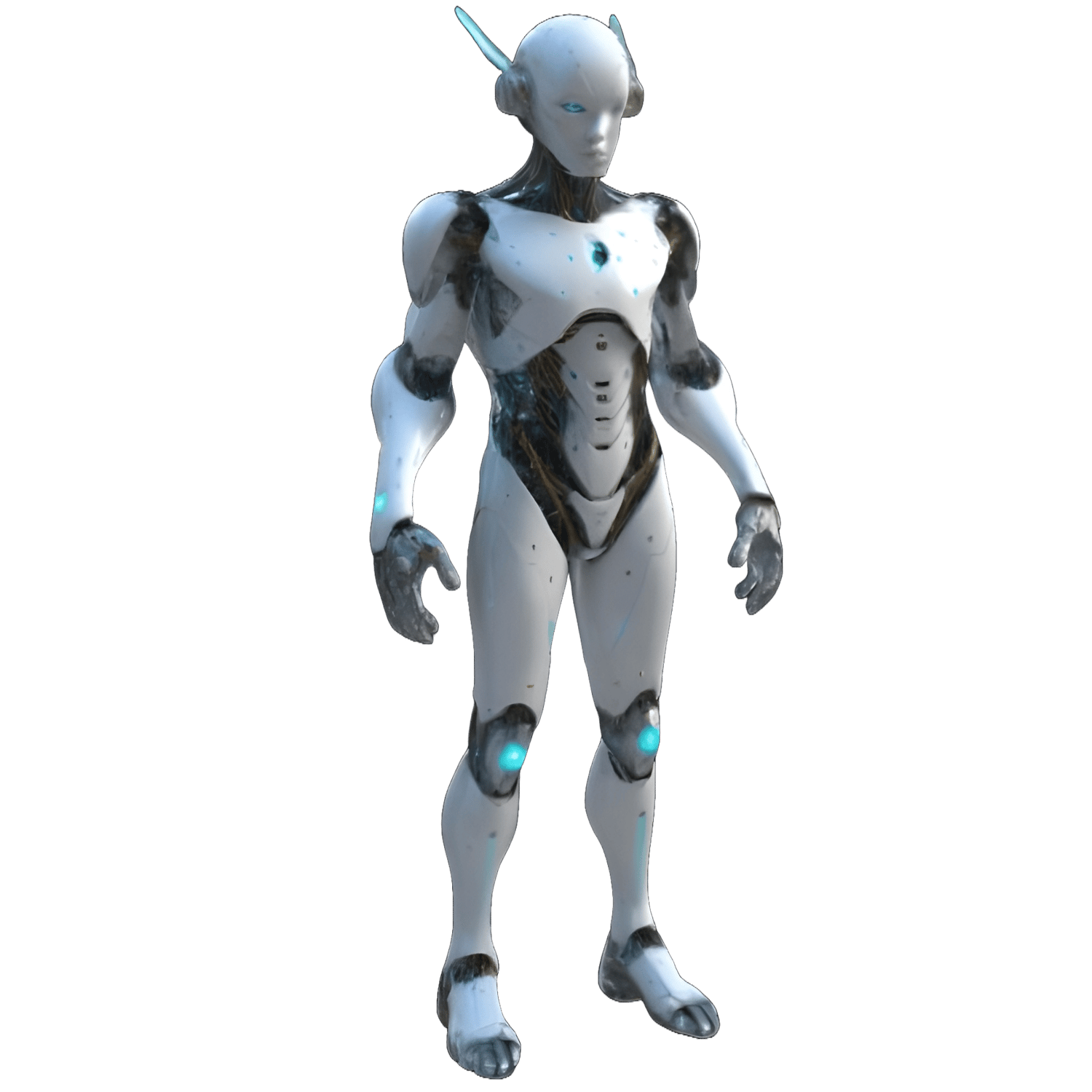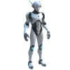 - A sleek humanoid android with blue accent lighting and smooth white plating