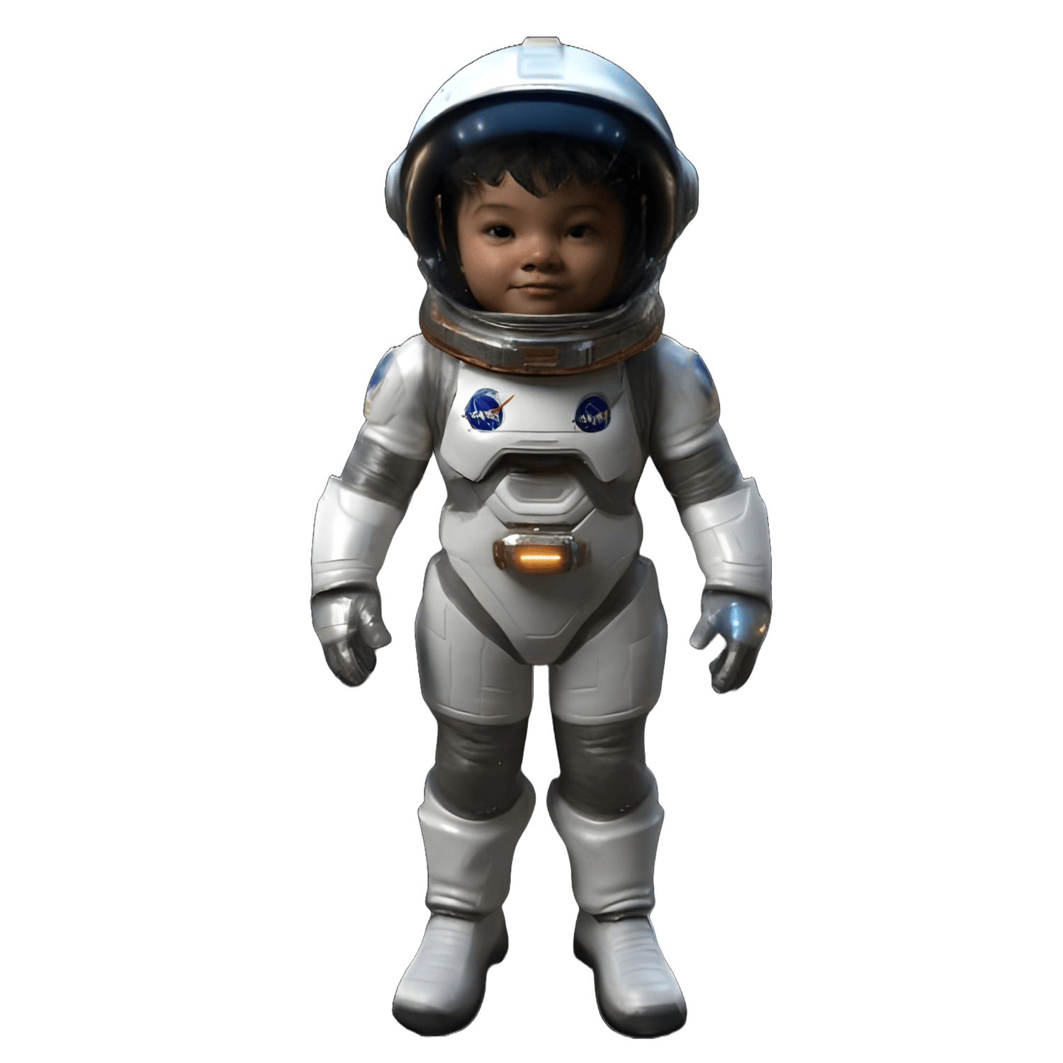 - A NASA-inspired astronaut suit design with a distinctive helmet and child-like proportions