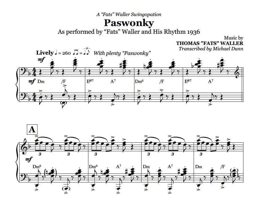 Here's my transcription of Fats' opening piano solo and the final chorus of a quirky instrumental called Paswonky.