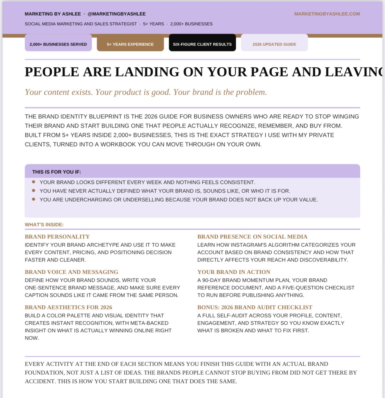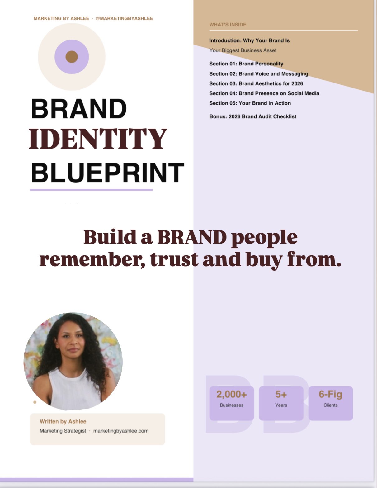 The Brand Identity Blueprint is the 2026 guide for business owners who are ready to stop winging their brand and start building one that people actually recognize, remember, and buy from. Built from 5+ years of working inside 2,000+ businesses across every industry, this is the strategy I use with my private clients, turned into a workbook you can move through on your own.