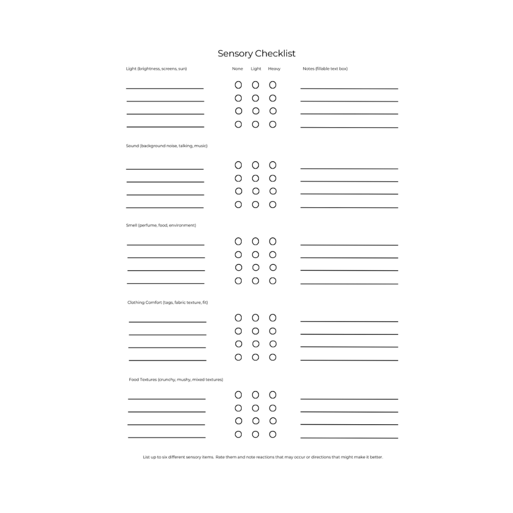 Sensory Checklist - Light, sound, textures — log it all in one place.