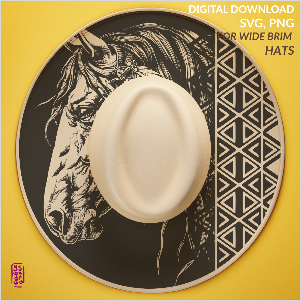 Tags: laser engraving file, wide brim hat svg, hat burning template, horse head design, cowboy hat art, western style svg, geometric pattern, digital download, laser cutter file, glowforge template, wood burning art, custom hat brim, rustic craft svg