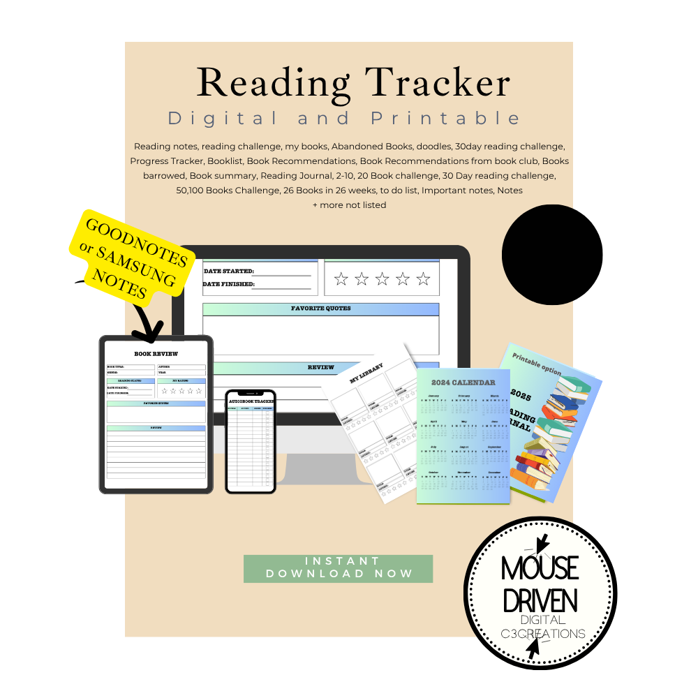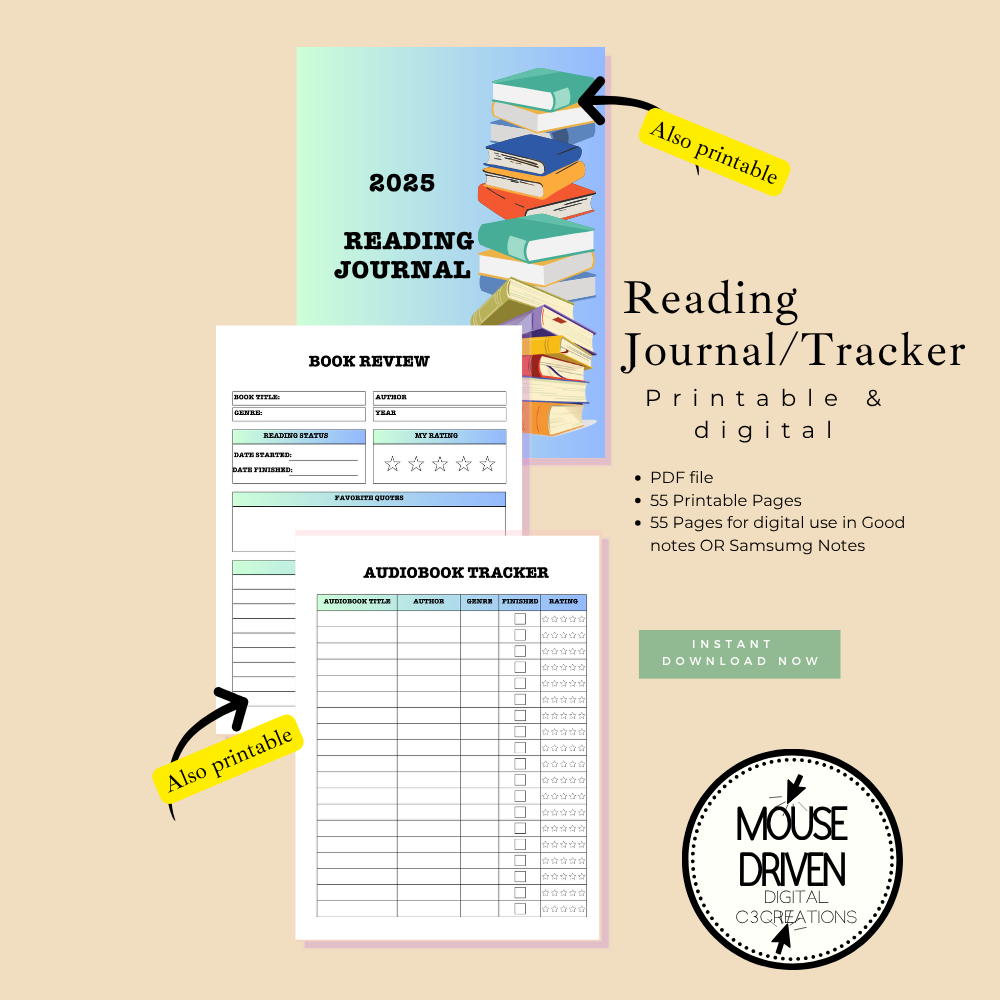 • You receive -------- (Including 12 Months style) Reading log printable journal pages in PDF format. From a Dropbox link.