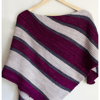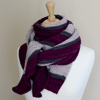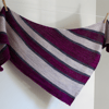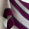 This asymmetrical three colour shawl is worked from one corner point to the opposite edge. Simple increase and decrease stitches are used while the coloured stripes are worked. A slipped stitch pattern is used for some stripes and garter stitch for others. Worked in this gorgeous merino and baby camel blend, this shawl is soft, squishy, and colourful.