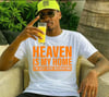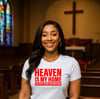 A conversation starter and soul statement. This crisp white tee features bold red block lettering: