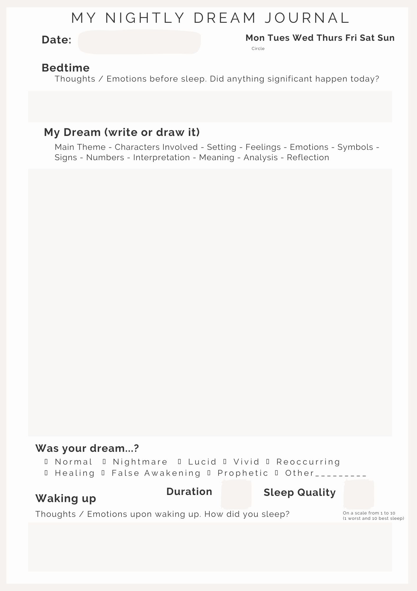 Within this page, you have the power to transcribe your daily dreams, record dream types, sleep duration, and quality, and delve into the depths of your thoughts, emotions, and feelings before slumber and upon waking.