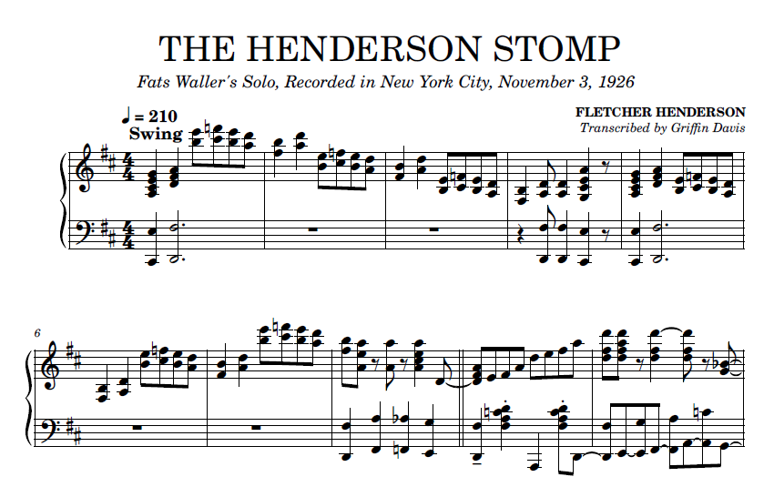 Transcription of Fats Waller's solo from "The Henderson Stomp," recorded on November 3, 1926 in New York City by Fletcher Henderson and his Orchestra.