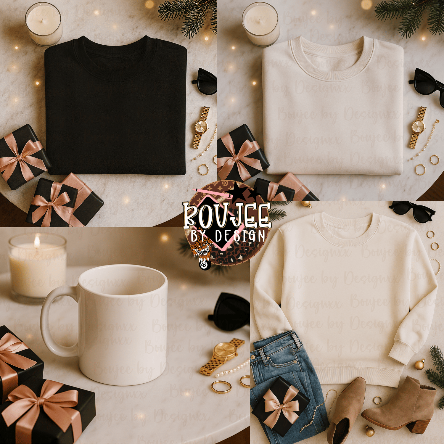 - π Lifestyle Cream Sweatshirt Mockup styled with jeans, booties, sunglasses & holiday accents