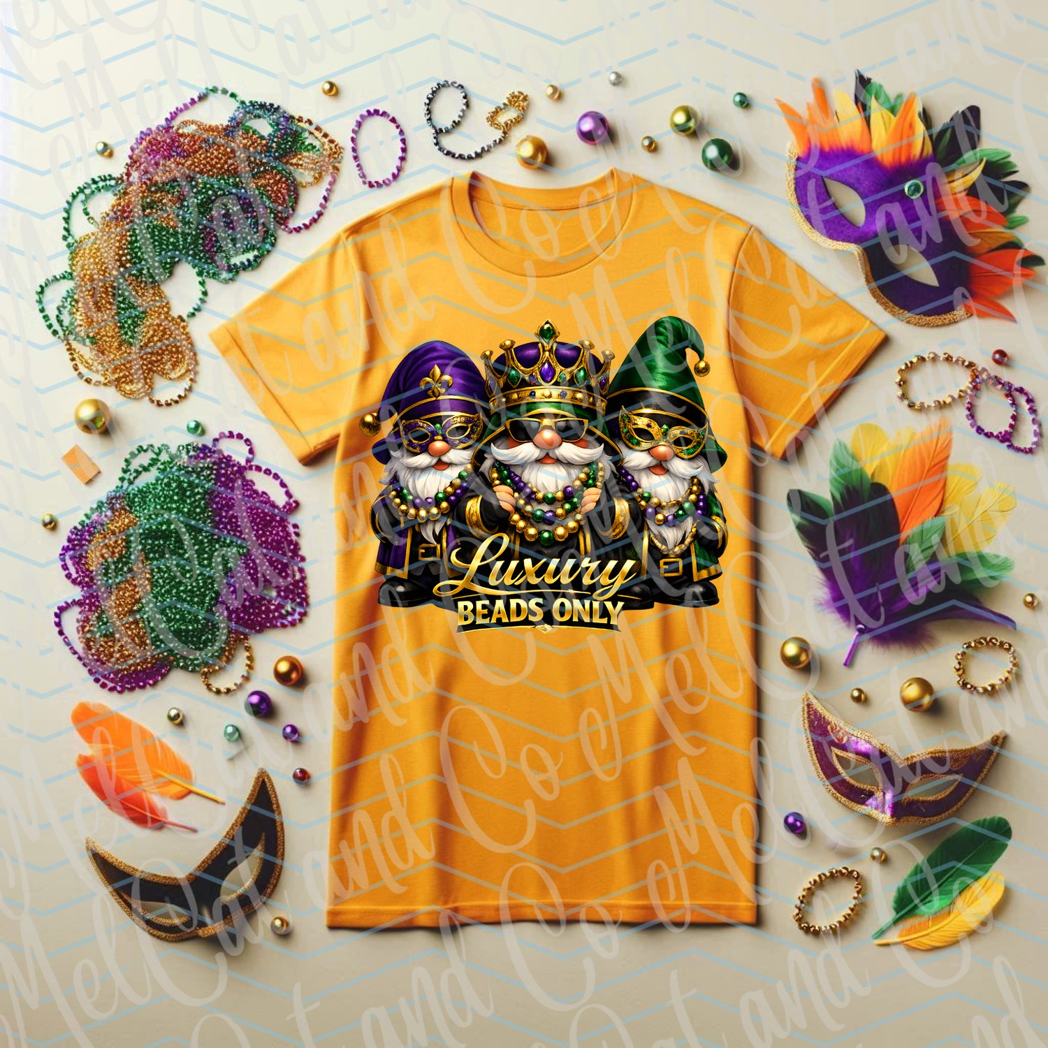 This eye-catching digital design features three stylish Mardi Gras gnomes dripping in purple, green, and gold beads, topped with masks, crowns, and serious Luxury Beads Only vibes. Perfect for those who take bead season seriously β classy, funny, and extra in all the right ways.