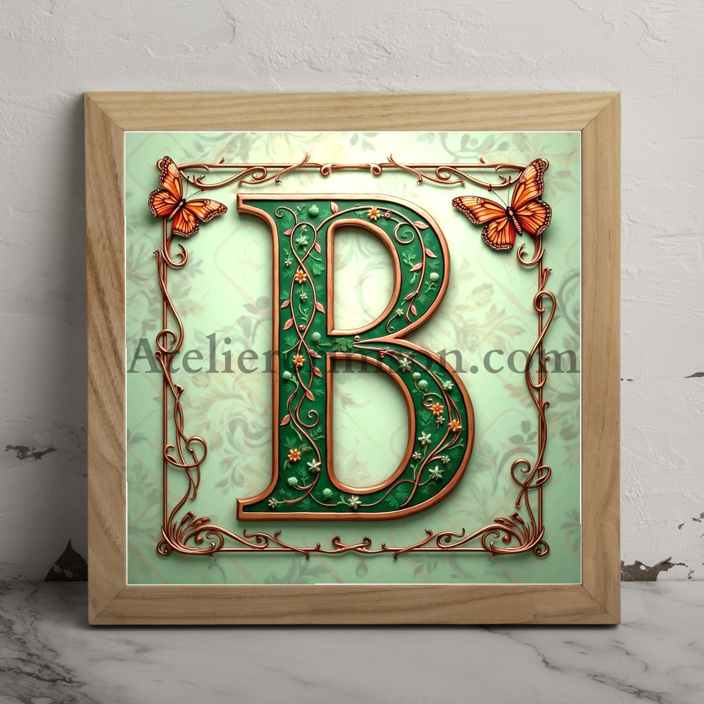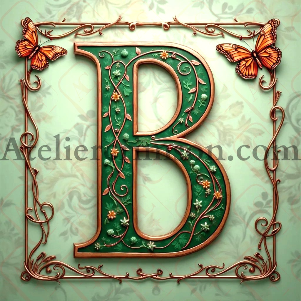 The letter B emerald and copper Art Nouveau Intricate design with floral patterns, butterflies, and vines. Elegant sage green background. Perfect for vintage lovers and typography enthusiasts.