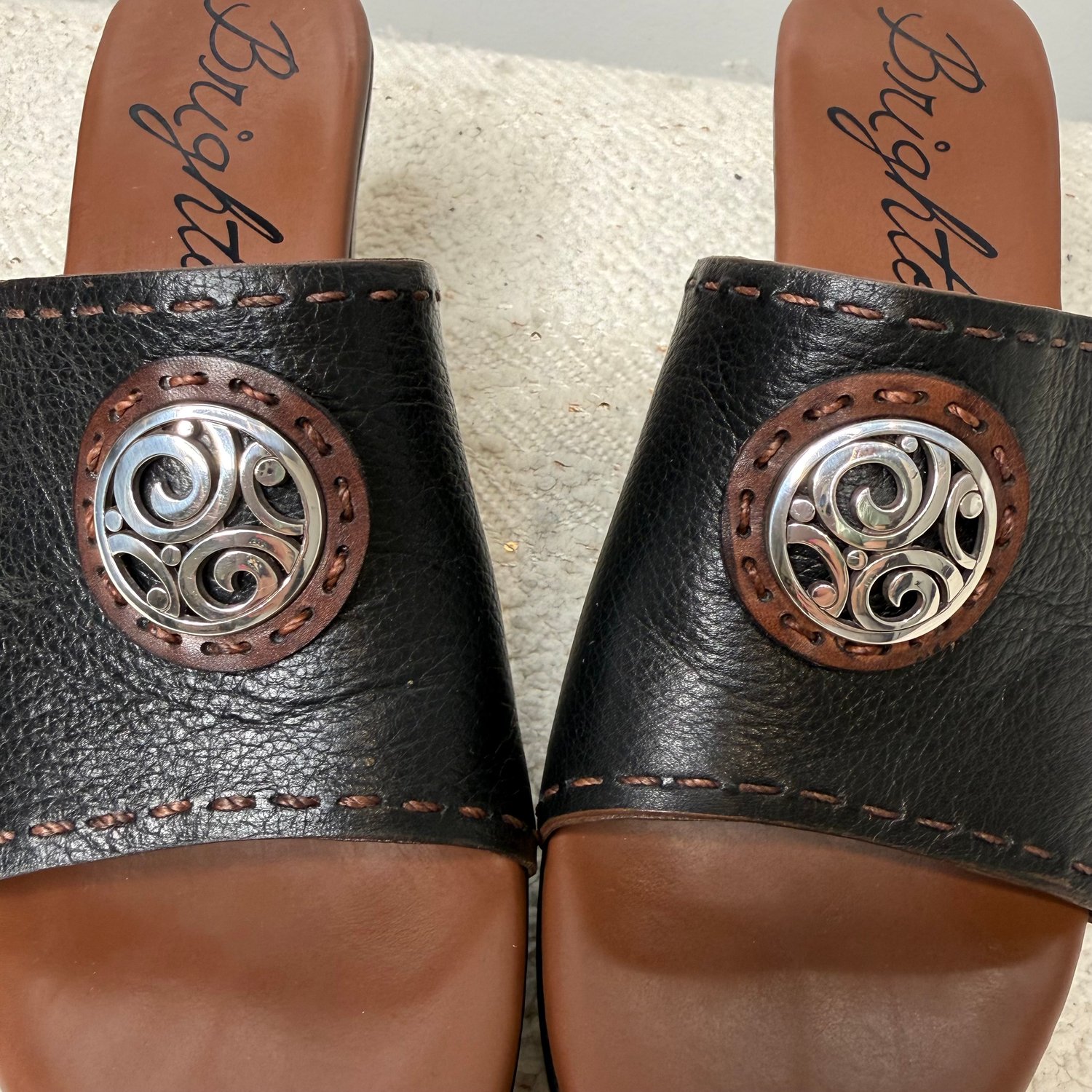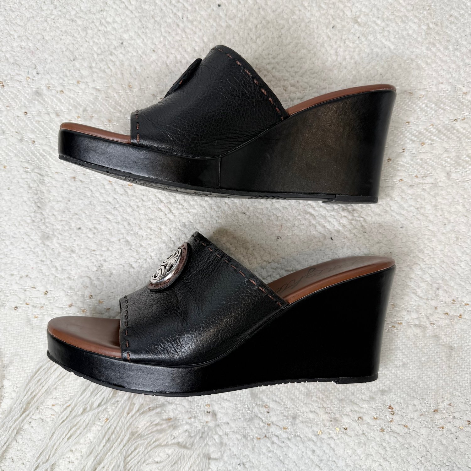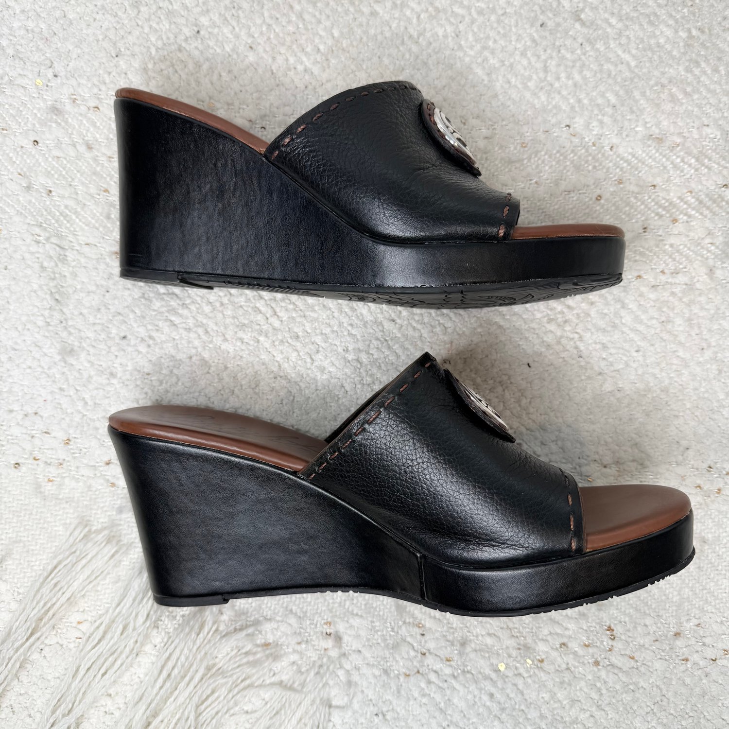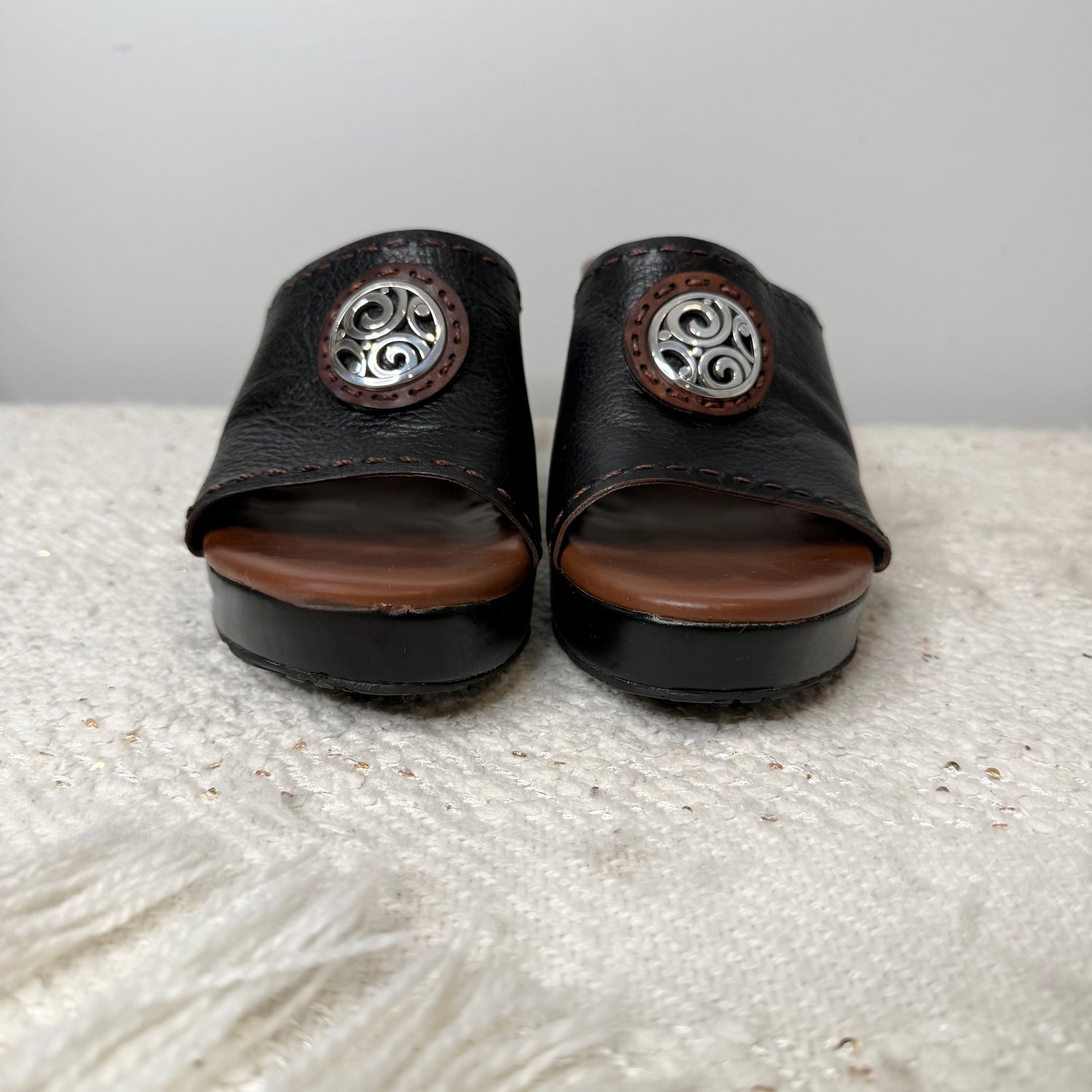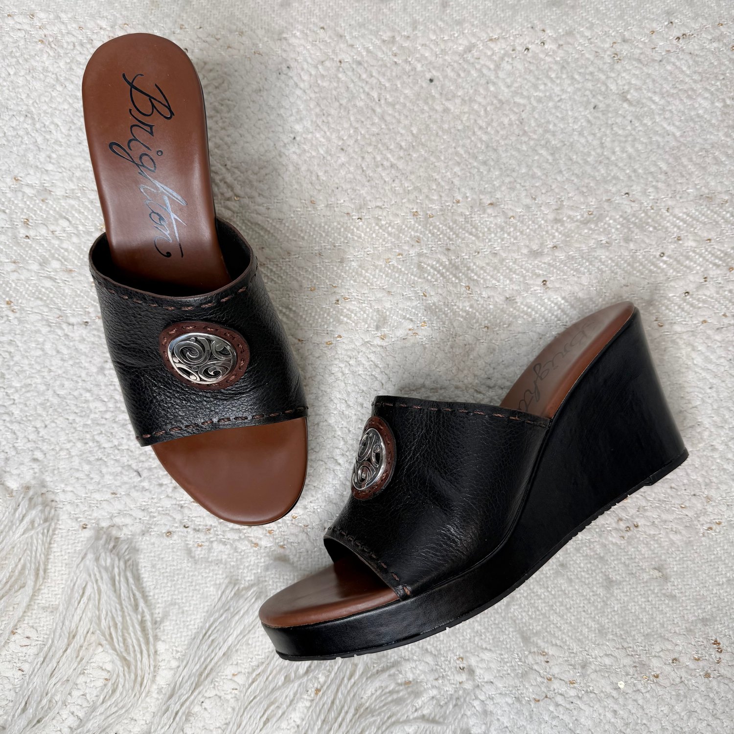 Brighton brown and black leather platform wedge heel open toe sandals with silver plated medallions.
