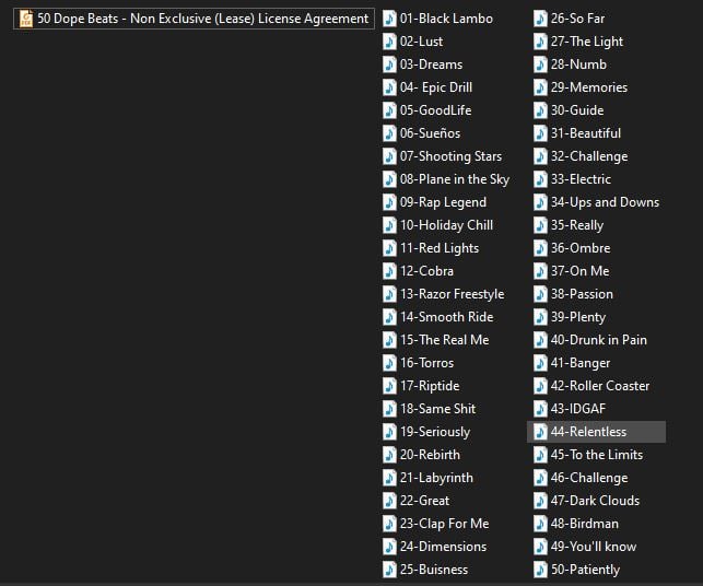 You get a zip file containing 50 untagged beats in high quality mp3 (320 kbps) and a Non-Exclusive (Lease) License document.
