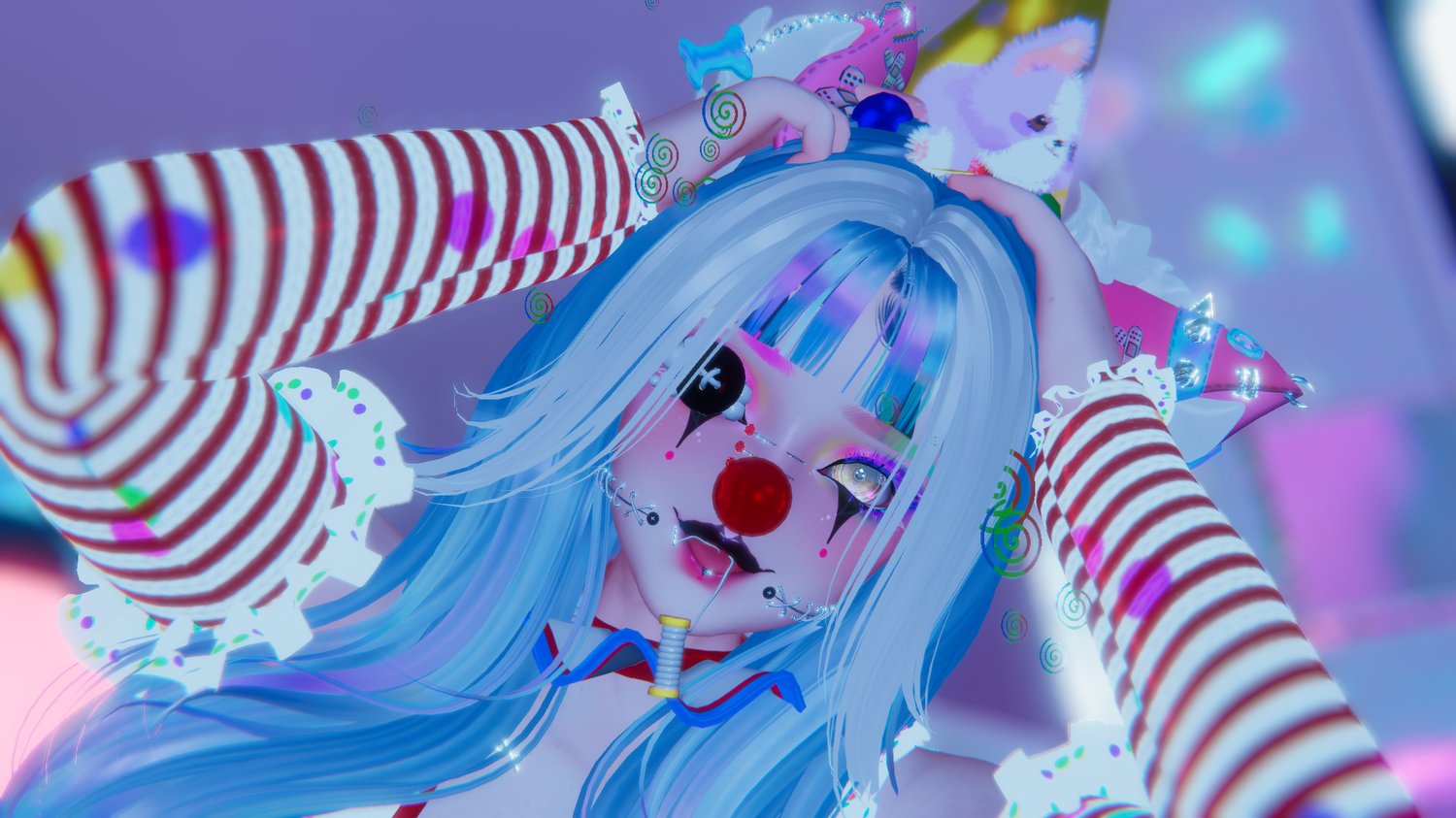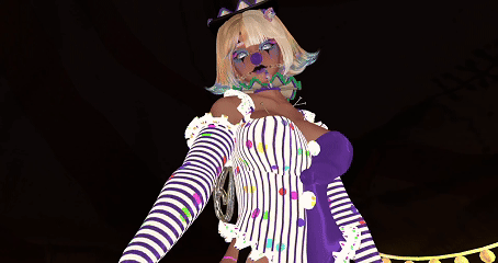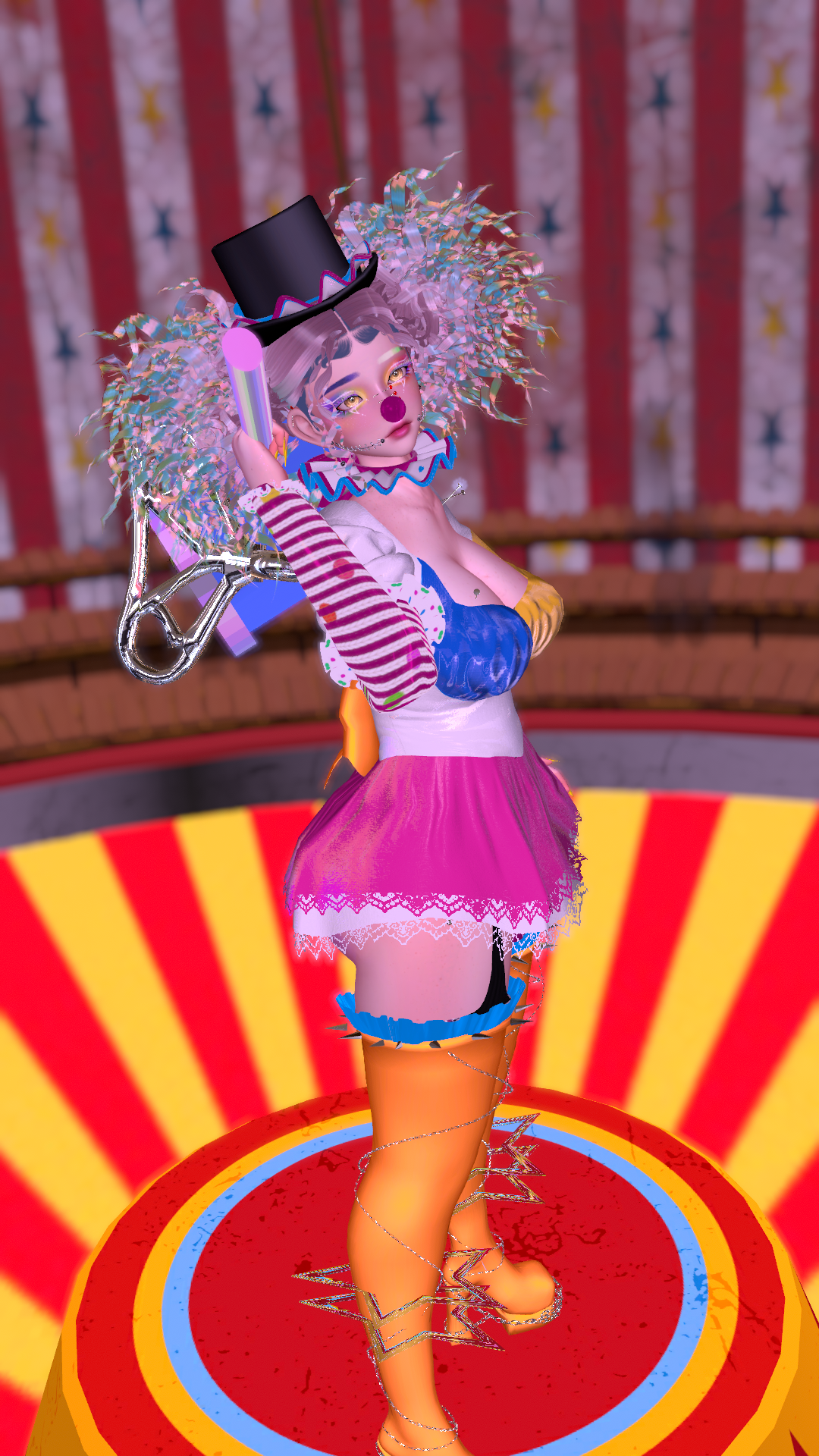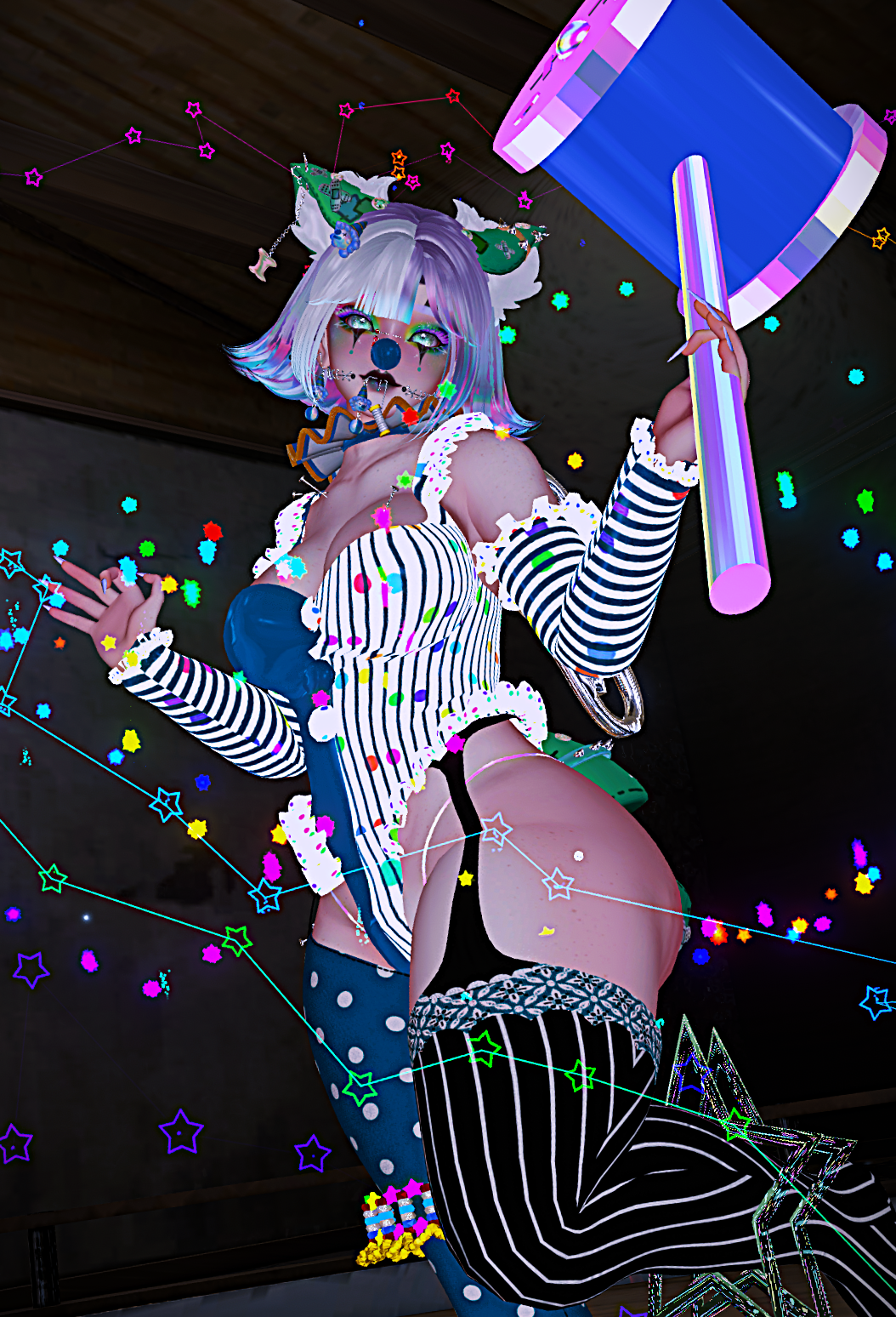 Toggles > Bodysuit, pants, thigh highs, thigh high boots. All accessories toggle off. Hair ( Puff pigtails > short bob > Long and straight > Long and straight with bangs). All over hue, hair hue, hair emission 1 and 2 hue, skin toggle, clown makeup switch, finger trails, hammer with trail, pup stuffie, head pat off, key off