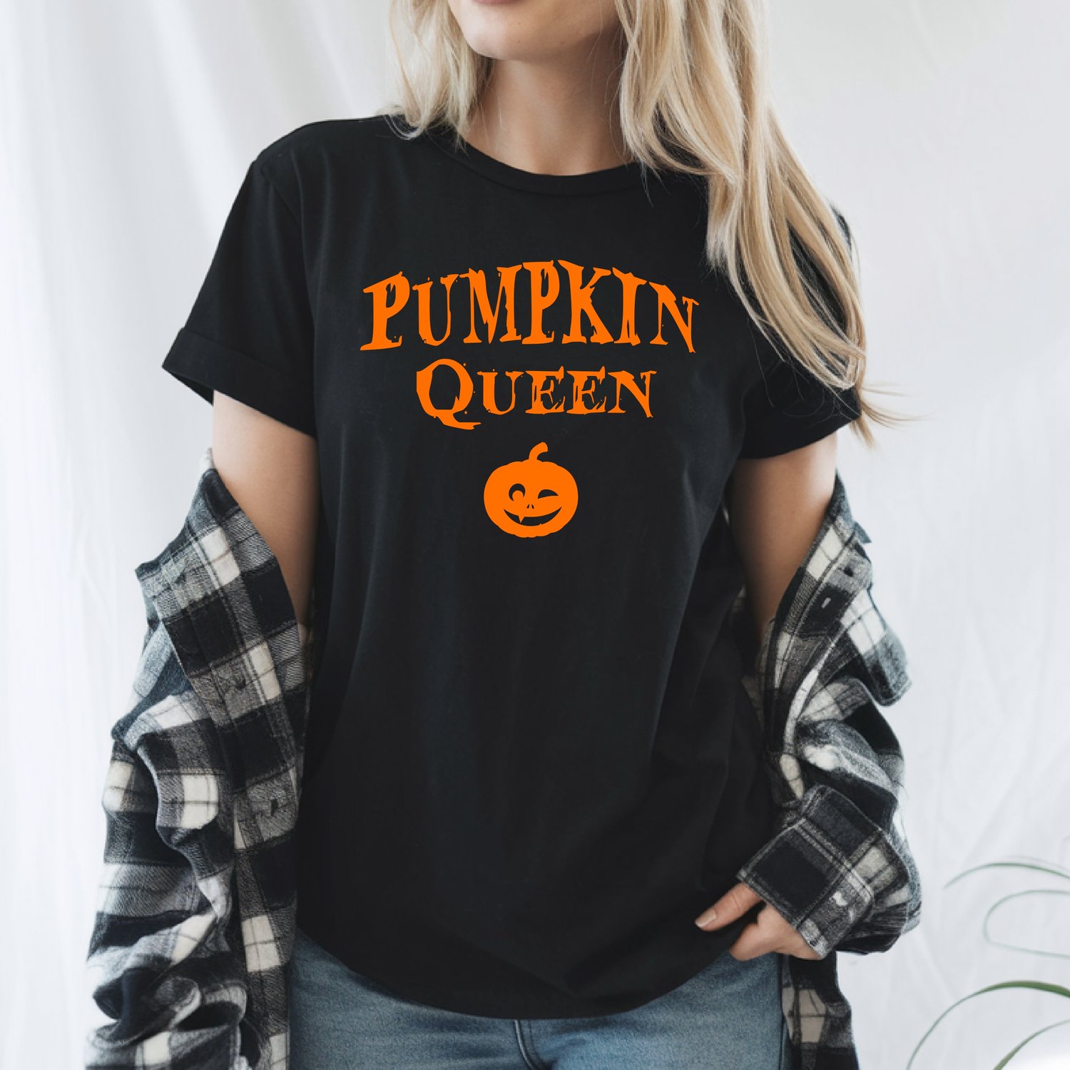 Pumpkin queen Halloween fan tee for adults made from medium fabric with a classic fit and tear-away label for a comfy and durable wear. Perfect for Halloween enthusiasts looking for a comfortable and stylish tee for the spooky season.