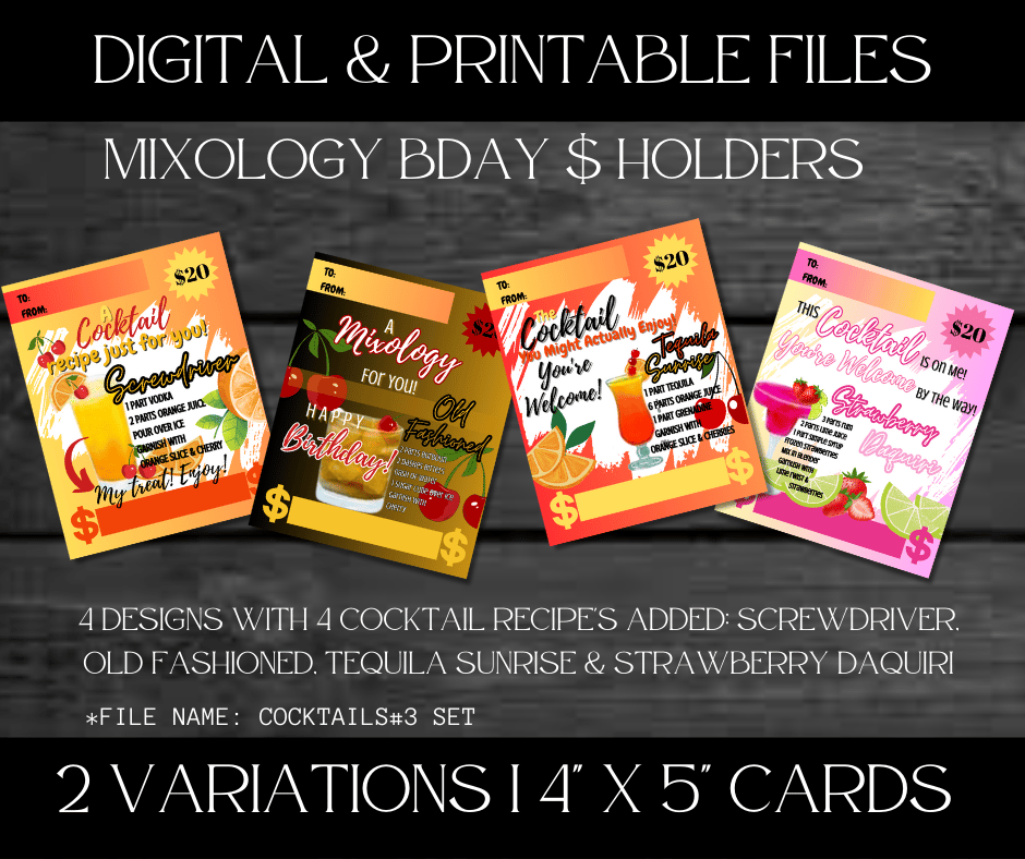 These Cocktails design comes with the recipes of famous cocktails or mixed drinks to give the recipient an idea of how to celebrate their day. These cards have random thoughts that came to mind. These are just a teaser of the different Mixology and Cocktails with Recipe Sets.