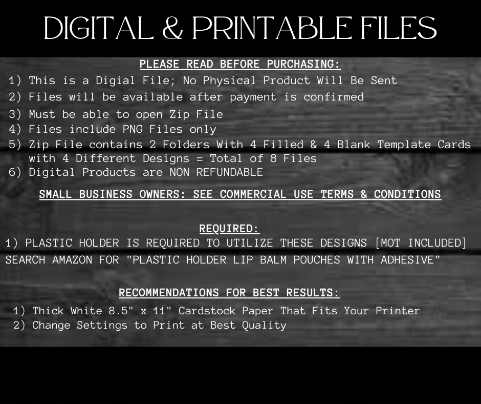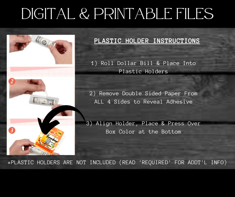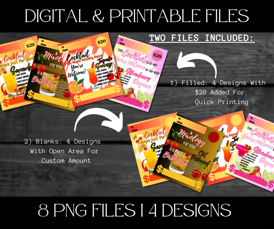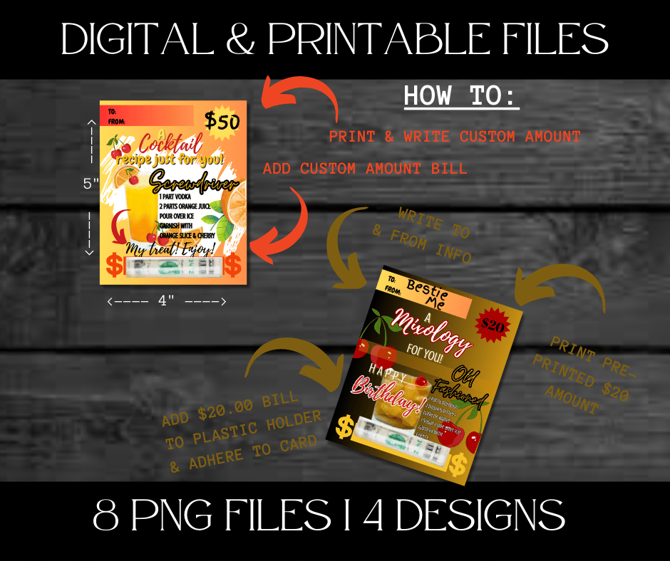 This Trendy $ Holder Cards comes in Zip Files with two PNG Folders. One Folder has Pre-Printed Amounts for Fast Printing. The other Folder has Blanks to write custom amounts. Both Folders has 4 Designs each = 8 PNG Files.