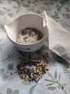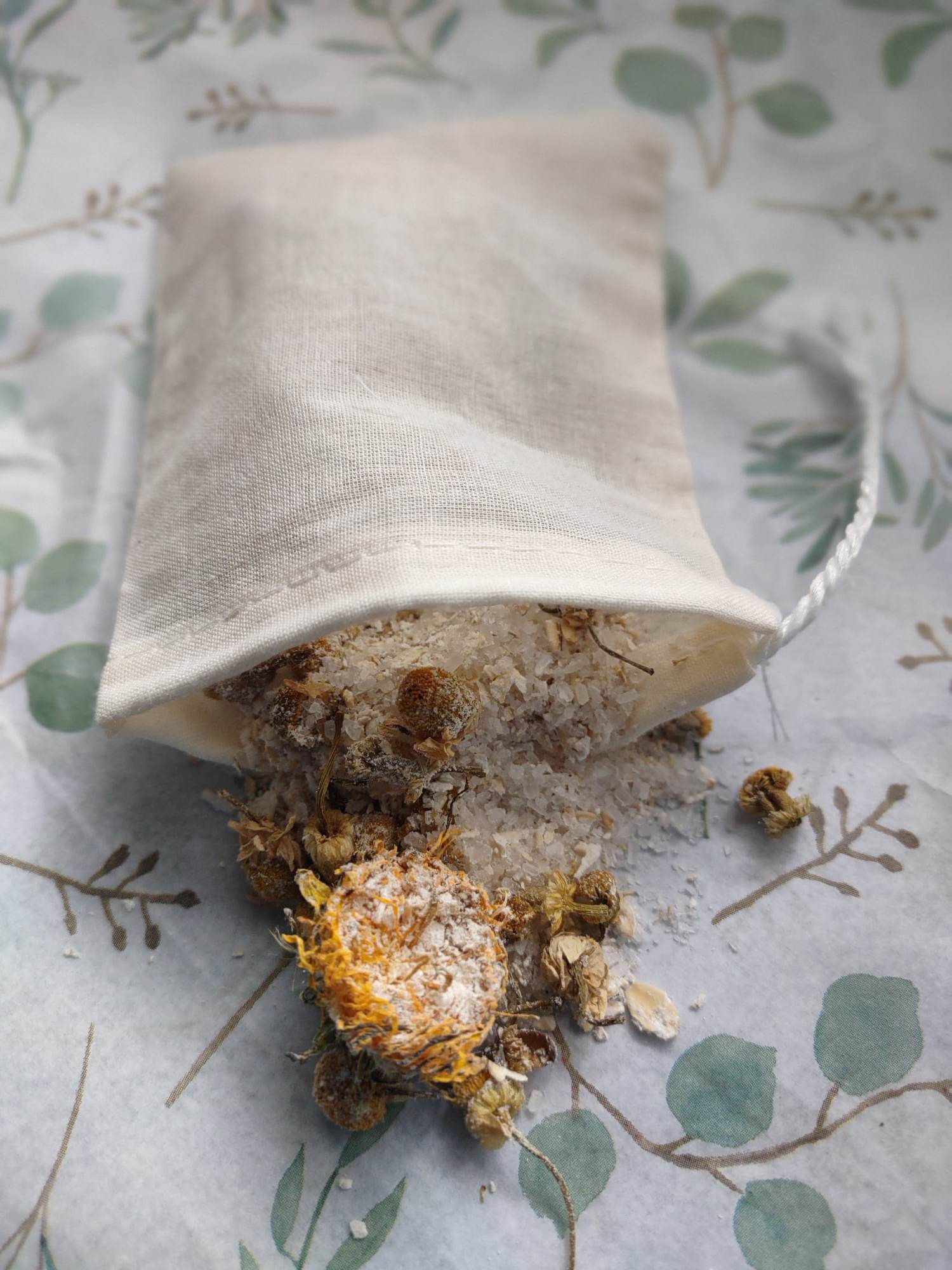 Dry Skin Herbal Soak: Vanilla epsom salt, dandelion, and chamomile.