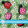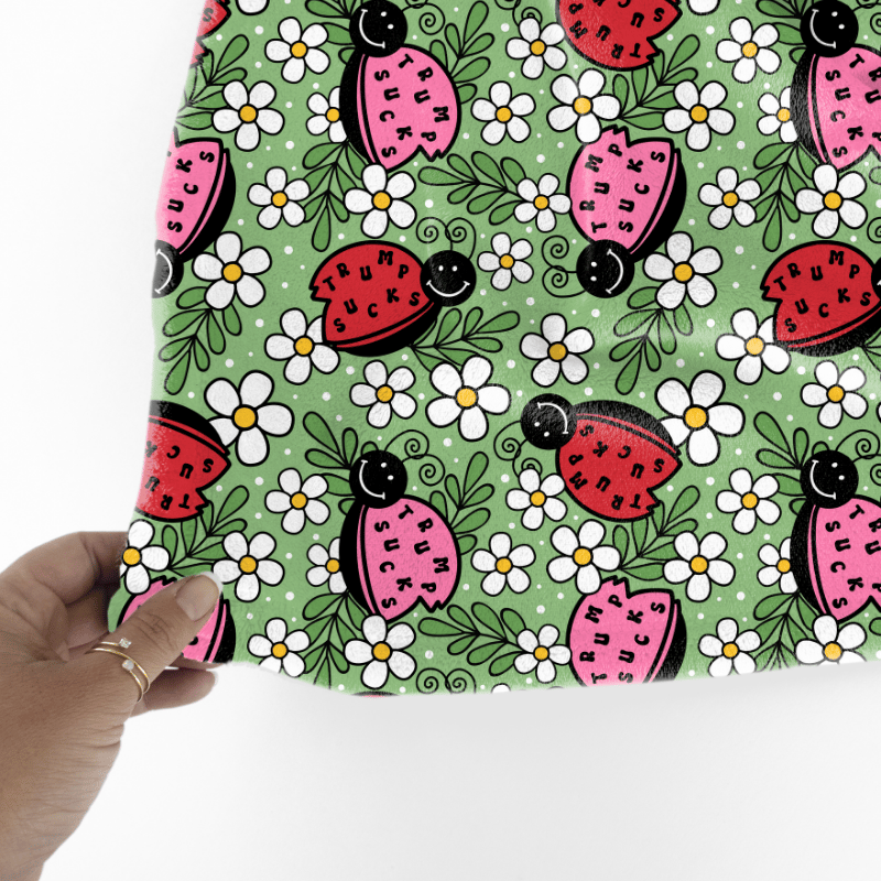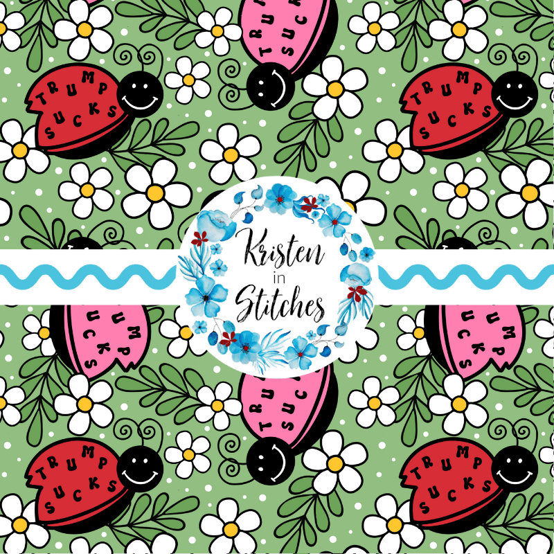 Sweary Fuck Trump ladybugs and daisy flowers on green.