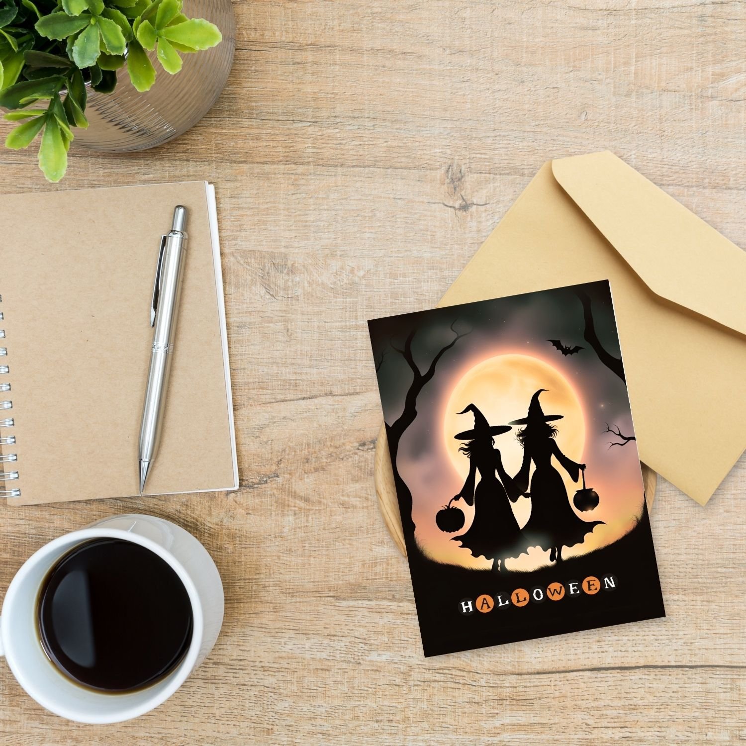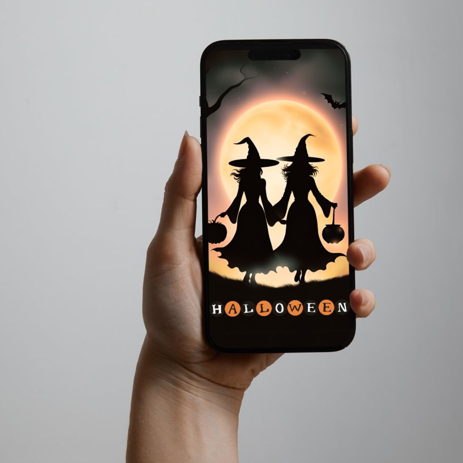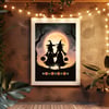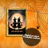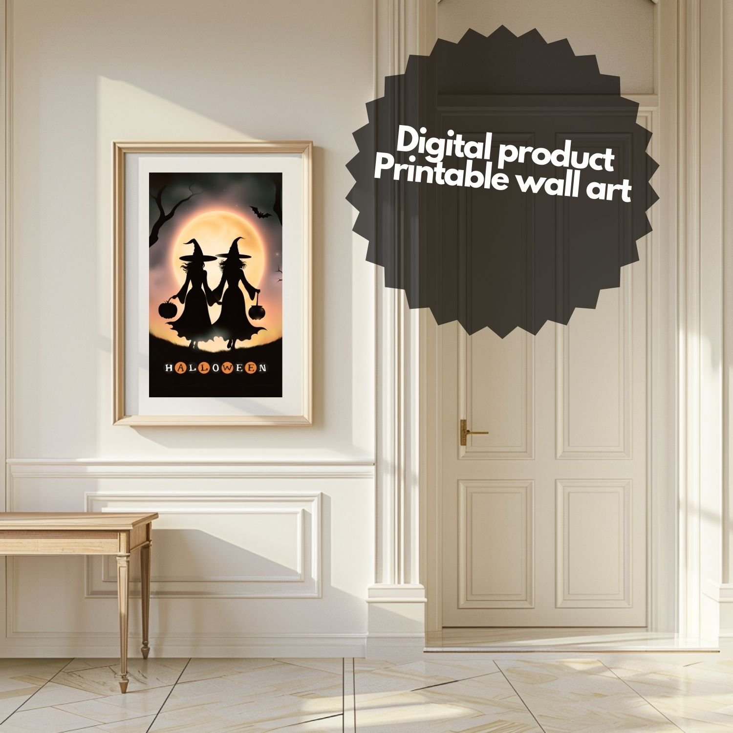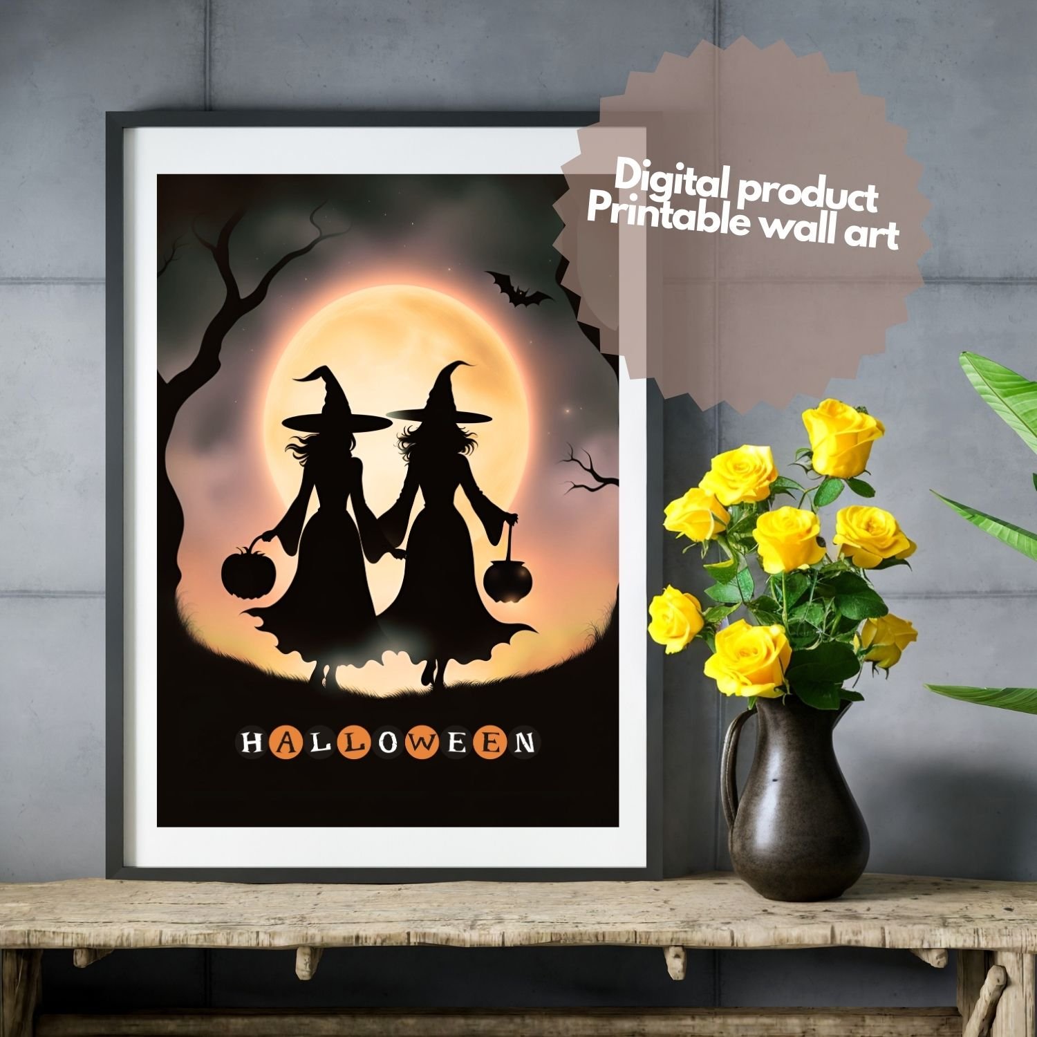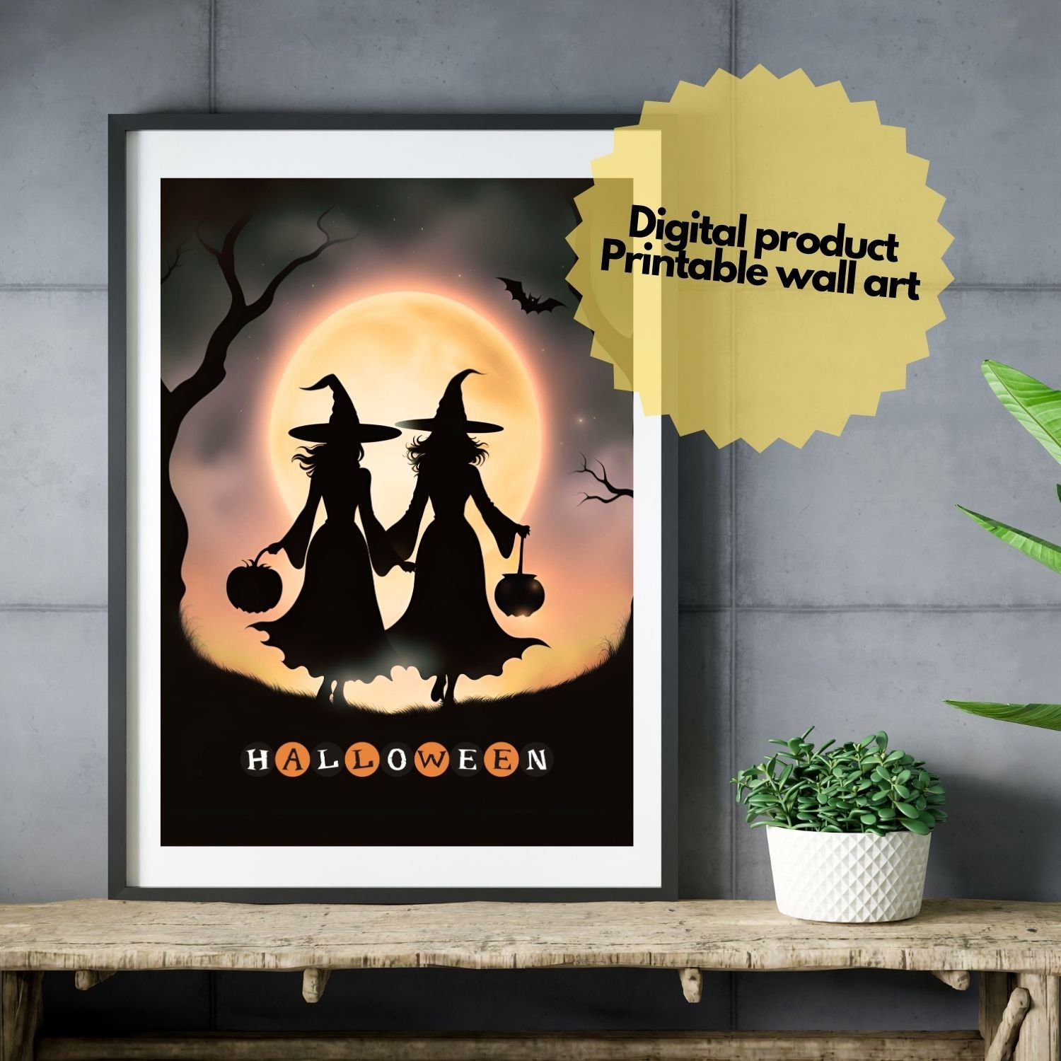 A digital file for printing; Witches walking on full moon. Halloween decoration poster. Women with magical powers. Night of horror. Witches in the dark. Printable Halloween poster. Wallpaper for your cell phone or invitation cards for Halloween parties.