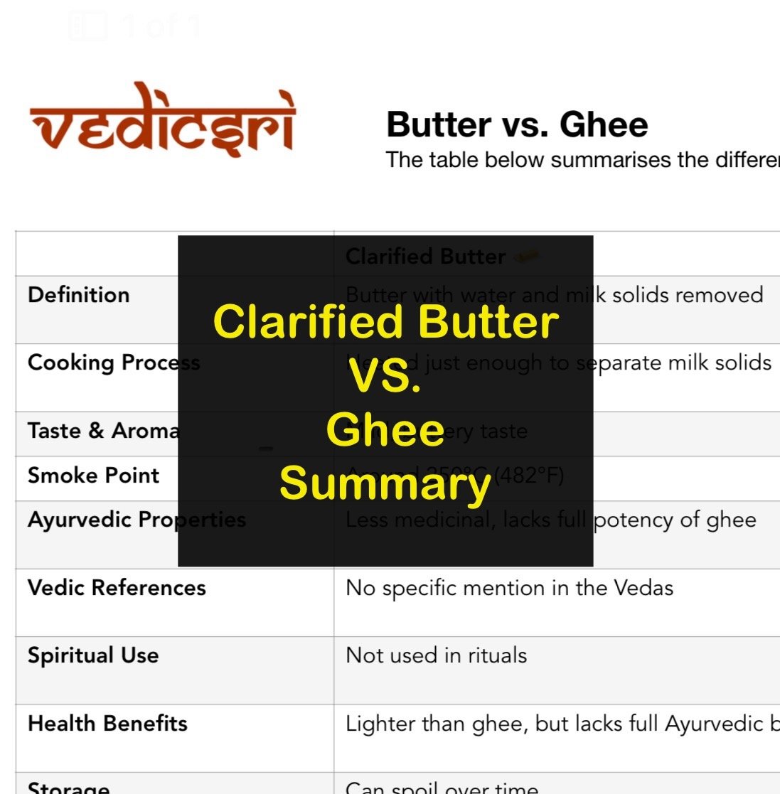 1 page summary on the differences between clarified butter and ghee, which has vedic origins.