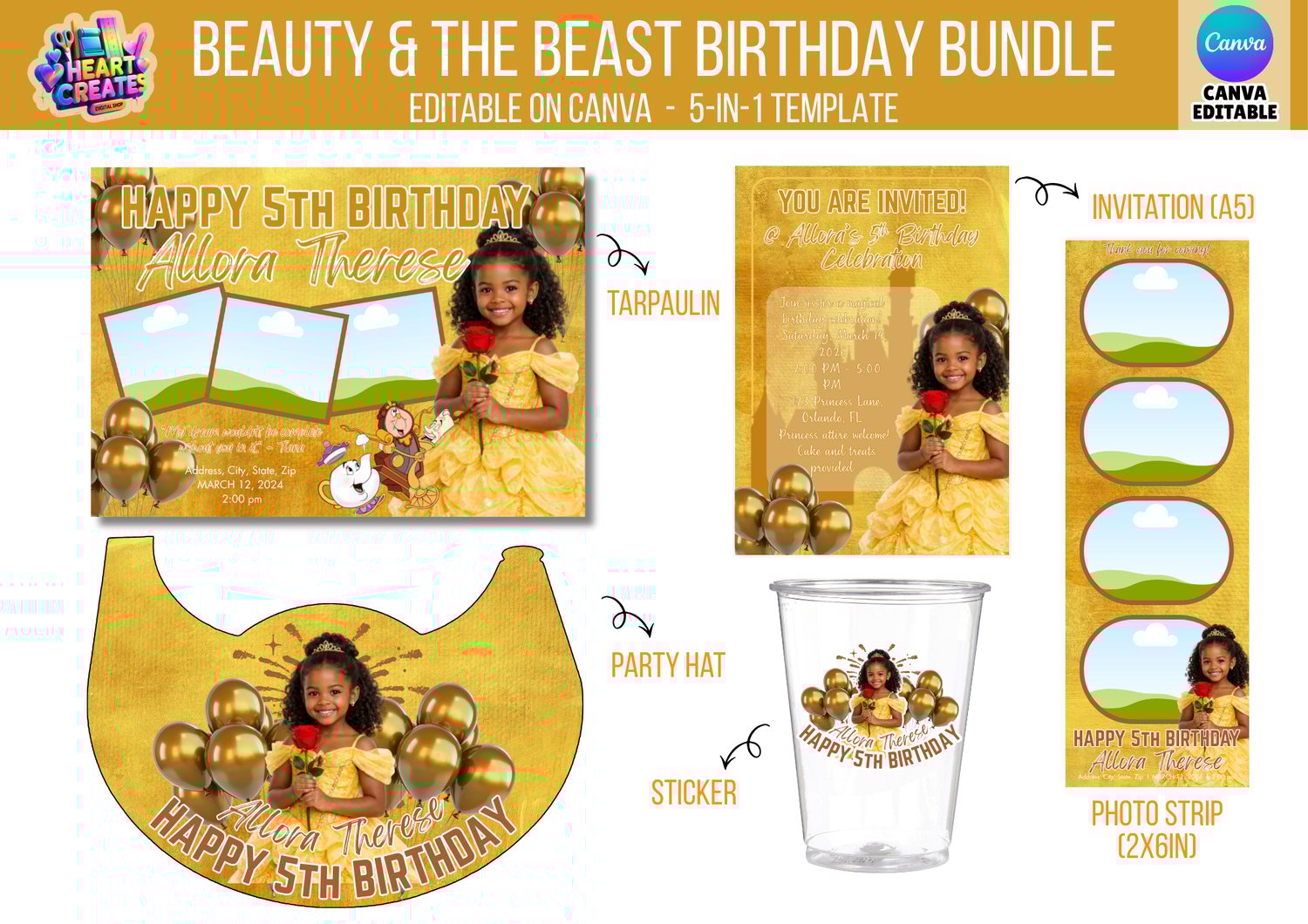 🌹 Beauty and the Beast Birthday Bundle Template | Editable Canva Birthday Set | Princess Birthday Party Decorations | Gold Rose Princess Party | Digital Download