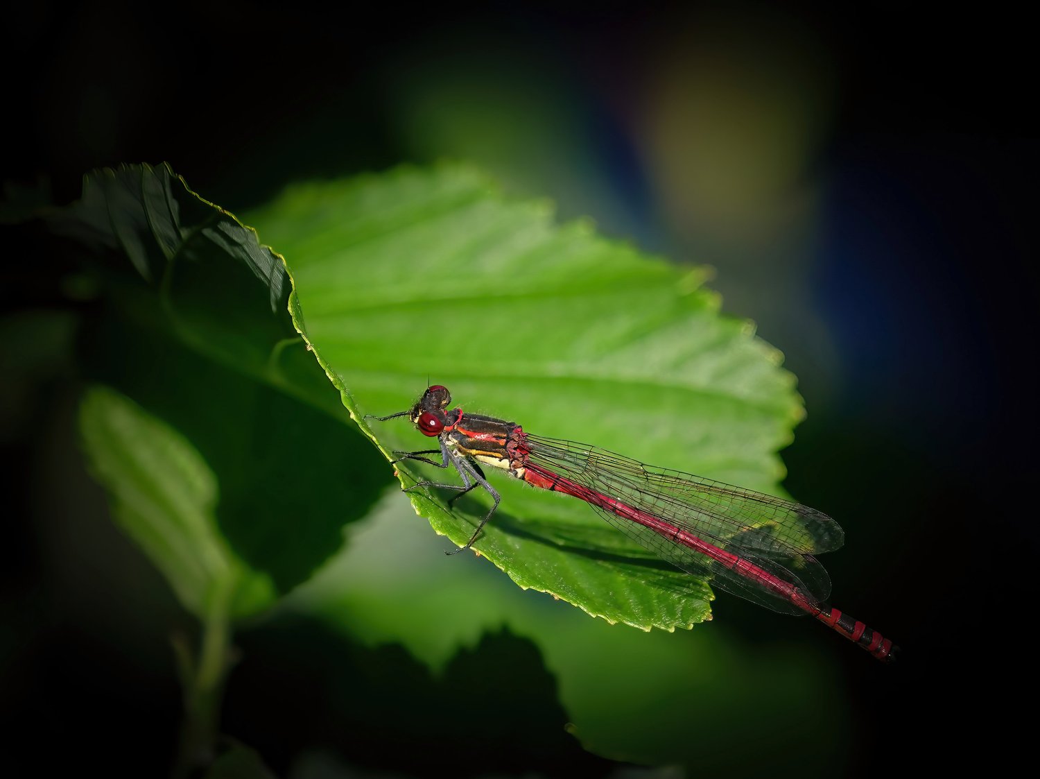 Small and colorful The Large red damselfly (Pyrrhosoma nymphula) sits on a leaf.