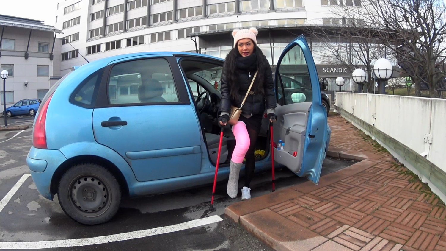 With a sneakers on the left foot and a pink LLC with a thick sock over her cast on the right leg of is Bunny crutching into a hotel lobby.She goes to her room which, fortunately for her, is the closest to the lobby to pick up some things.We then follow Bunny as she crutches back to the car again.