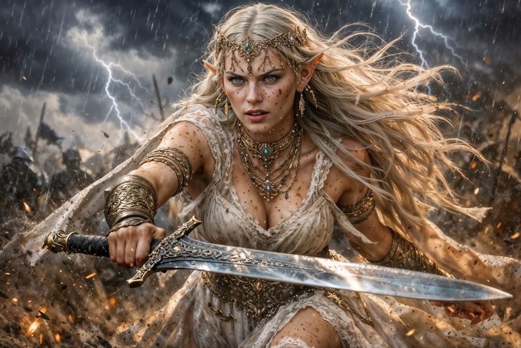 This true 10K elf fantasy artwork captures a battle-born elven queen in the heart of a raging storm—lightning tearing the sky, rain and ash whipping through her flowing hair, and jeweled gold filigree gleaming against a warrior’s resolve. Her blade flashes with etched elegance, her gaze is unshakable, and the battlefield around her erupts into chaos as if the world itself is bowing to her arrival.