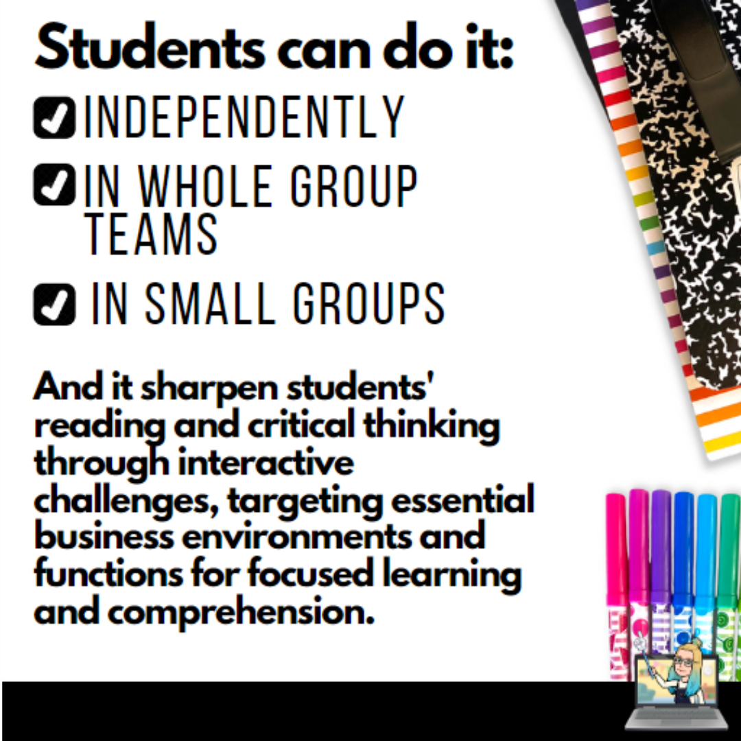 This Escape Room is crafted to enhance close reading skills while exploring business environments and functions. Students will delve into the material, reading and rereading the passage to answer questions and solidify their understanding of the three key environments: micro, market, and macro. ๐๐ก