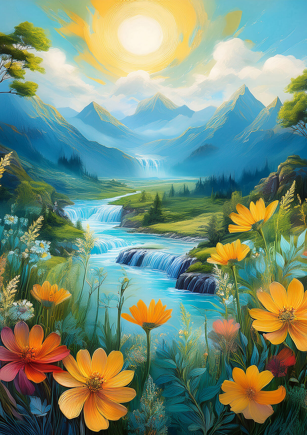 The imagery of majestic mountains and radiant paths symbolizes goal setting, focus, and forward movement, energizing your space to support professional success.