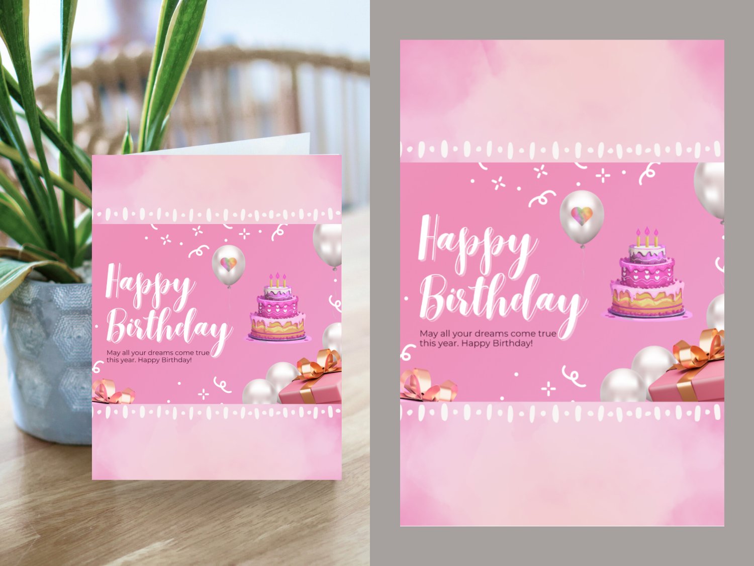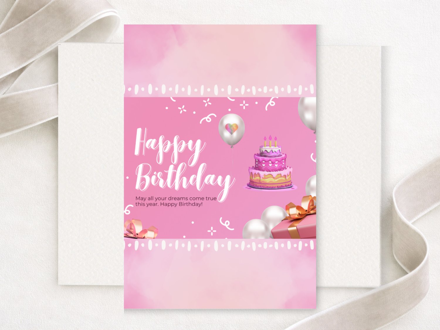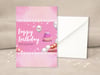 Pink Birthday Card with Cake and Balloons – Printable 5x7 Folded Card
