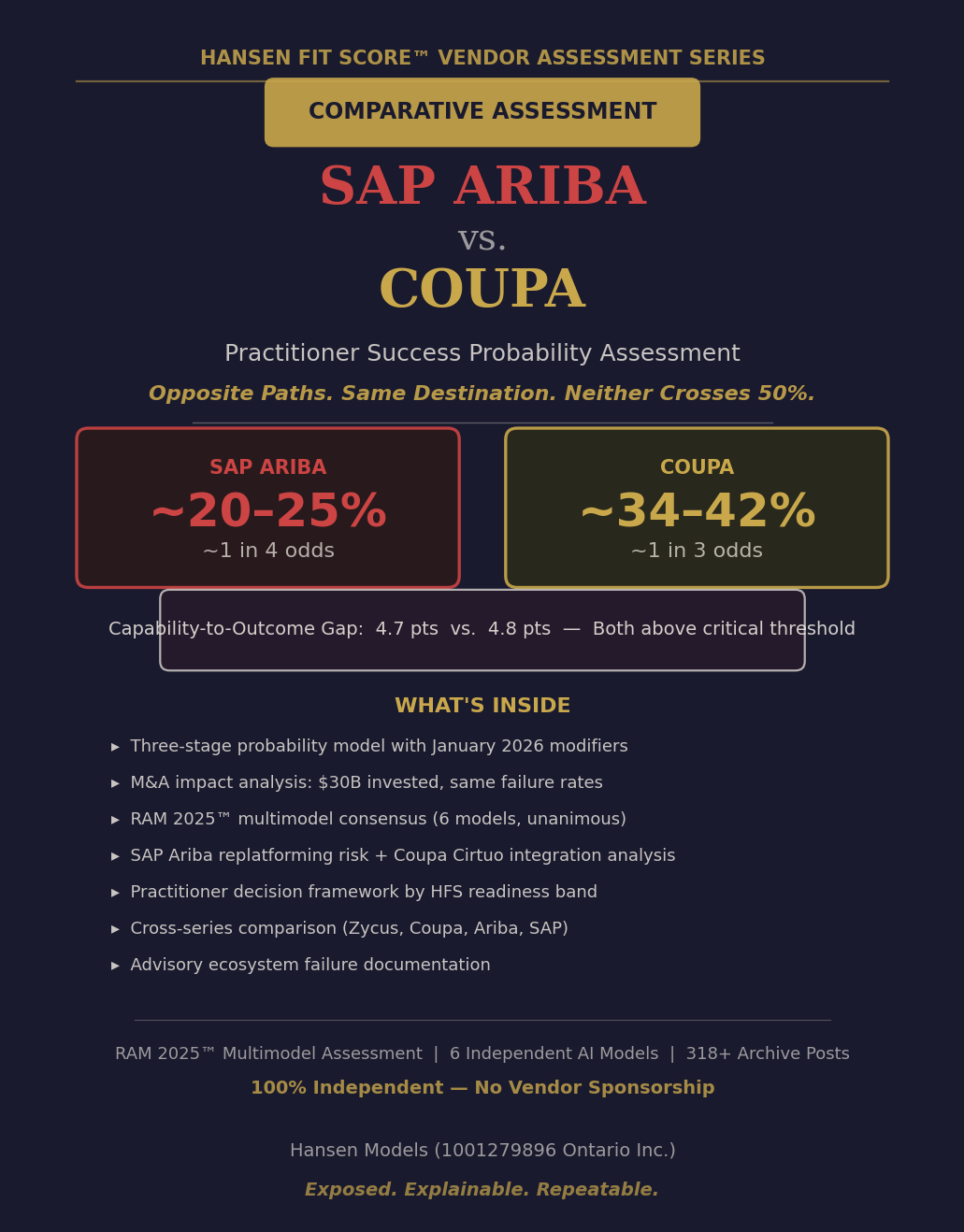 RAM 2025™ multimodel validation using six independent AI models. Evidence base: 318+ Procurement Insights archive posts spanning 2007–2026, two completed HFS Vendor Assessments (SAP Ariba: 14 pages, three phases; Coupa: 6 pages, five ownership phases), and publicly available data. 100% vendor-neutral — no vendor interviews, no demos, no sponsorship.