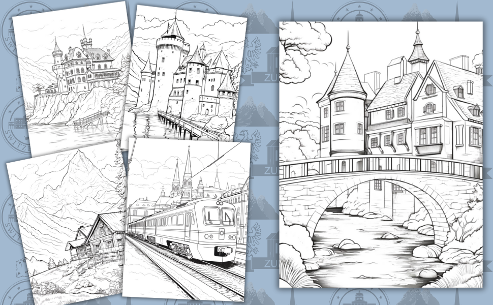 Soaring mountains and beautiful cityscapes. This coloring book is full of iconic landmarks and everything you could imagine Switzerland is.