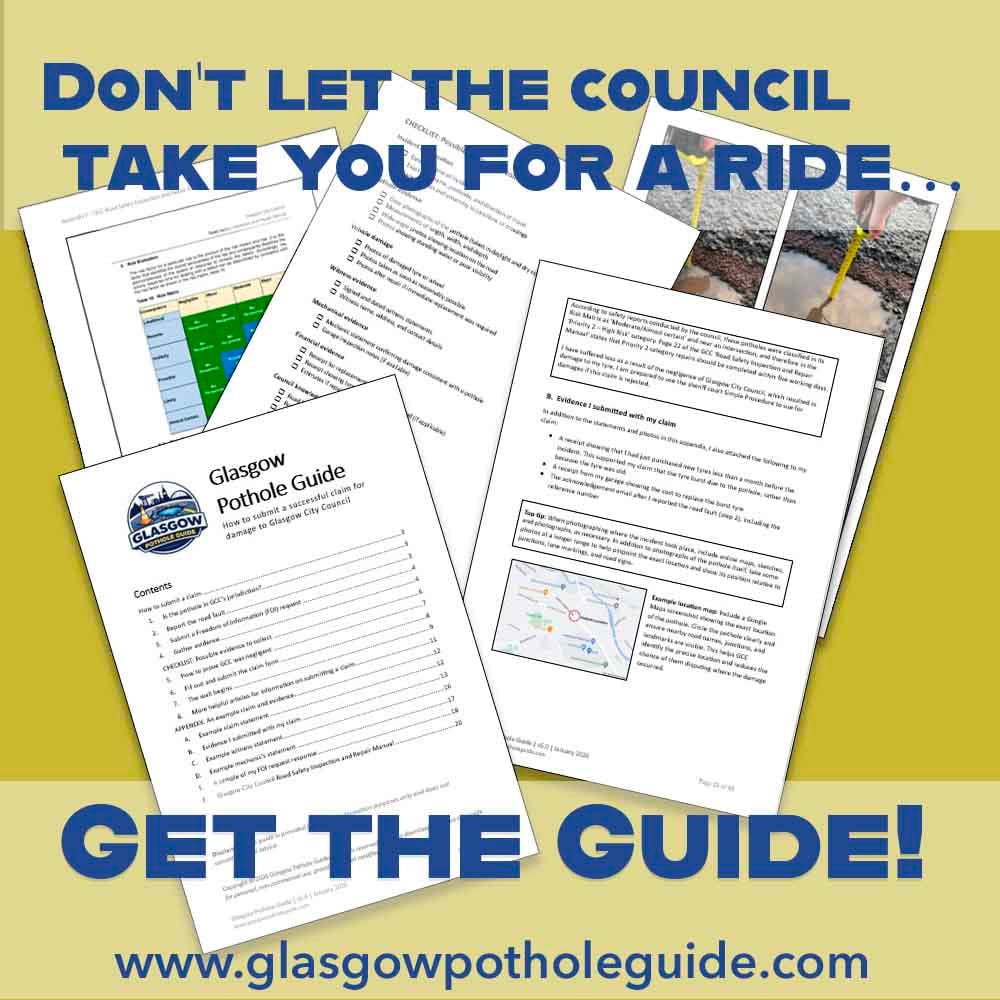 Please be sure to let me know the outcome of your pothole claim, and get in touch at glasgowpotholeguide@gmail.com if you have any questions!