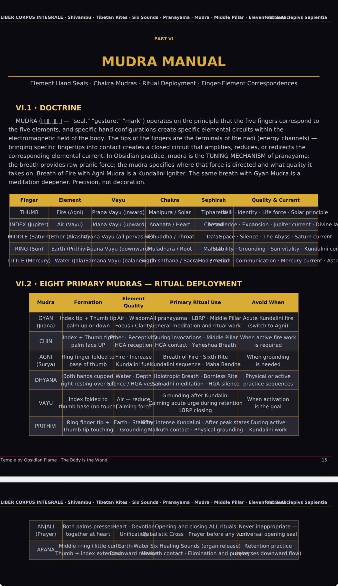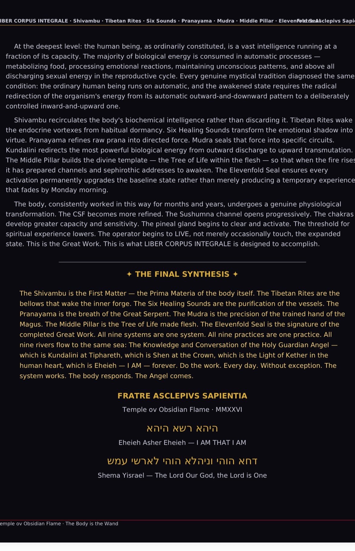 ∙ All attribution tables — Kosha/Qabalistic synthesis, alchemical correspondences, physiological mechanisms, psychological architecture, the final synthesis