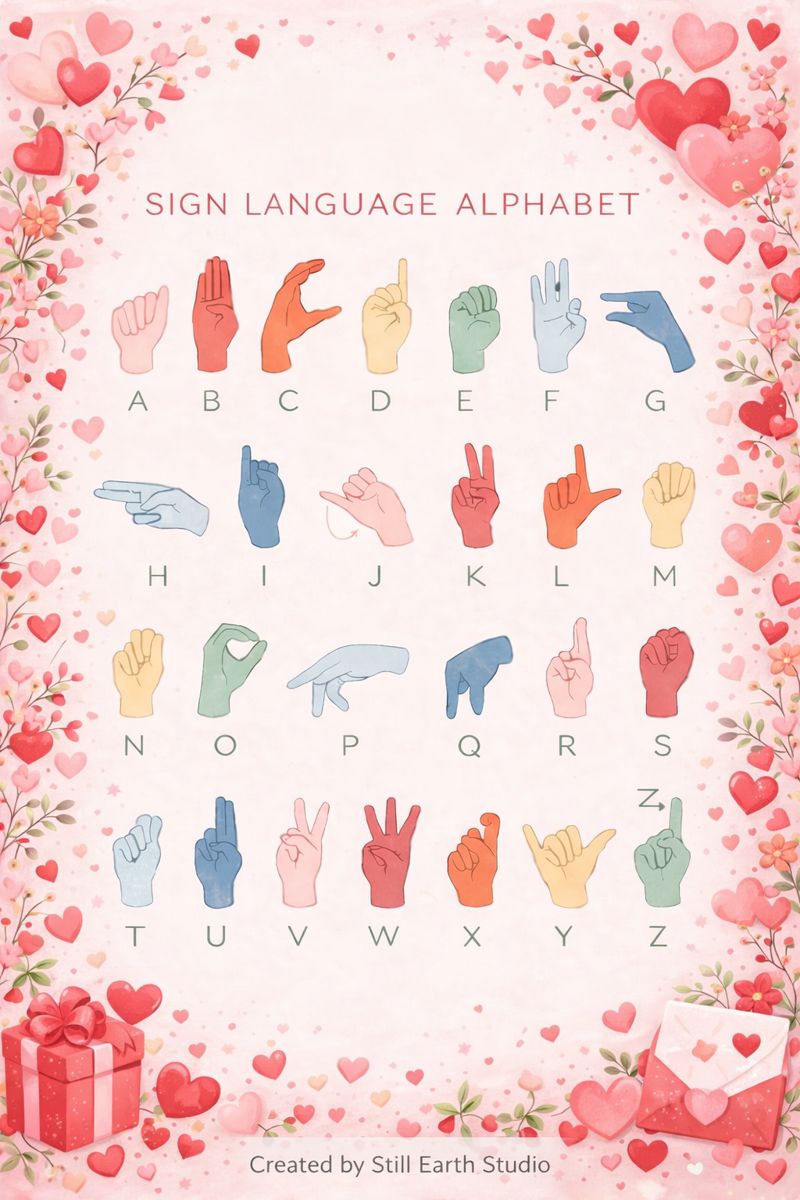 Celebrate learning and inclusion with this Valentine’s Day–themed ASL Alphabet poster featuring the American Sign Language alphabet A–Z. Designed with soft hearts, warm colors, and a calm layout, this printable makes learning sign language engaging while remaining accessible and visually friendly.