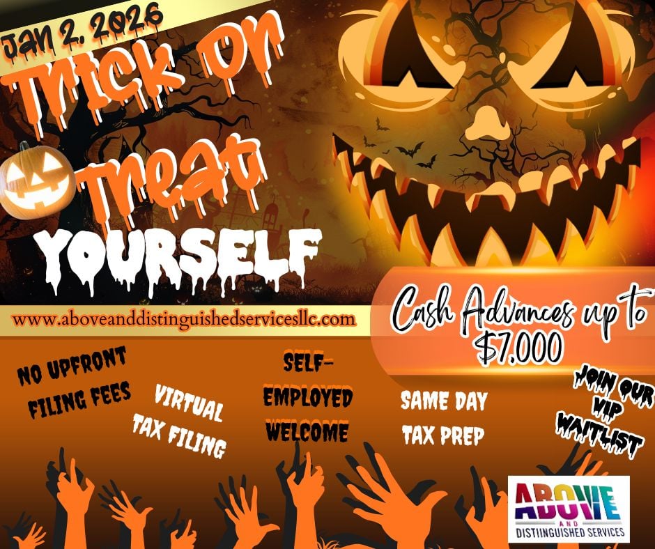 Give your tax promotions a spooky twist with our “Trick or Treat Yourself” flyer template. Designed with bold Halloween visuals and eye-catching fonts, this flyer is perfect for marketing cash advances, tax prep services, and seasonal offers that grab attention fast.