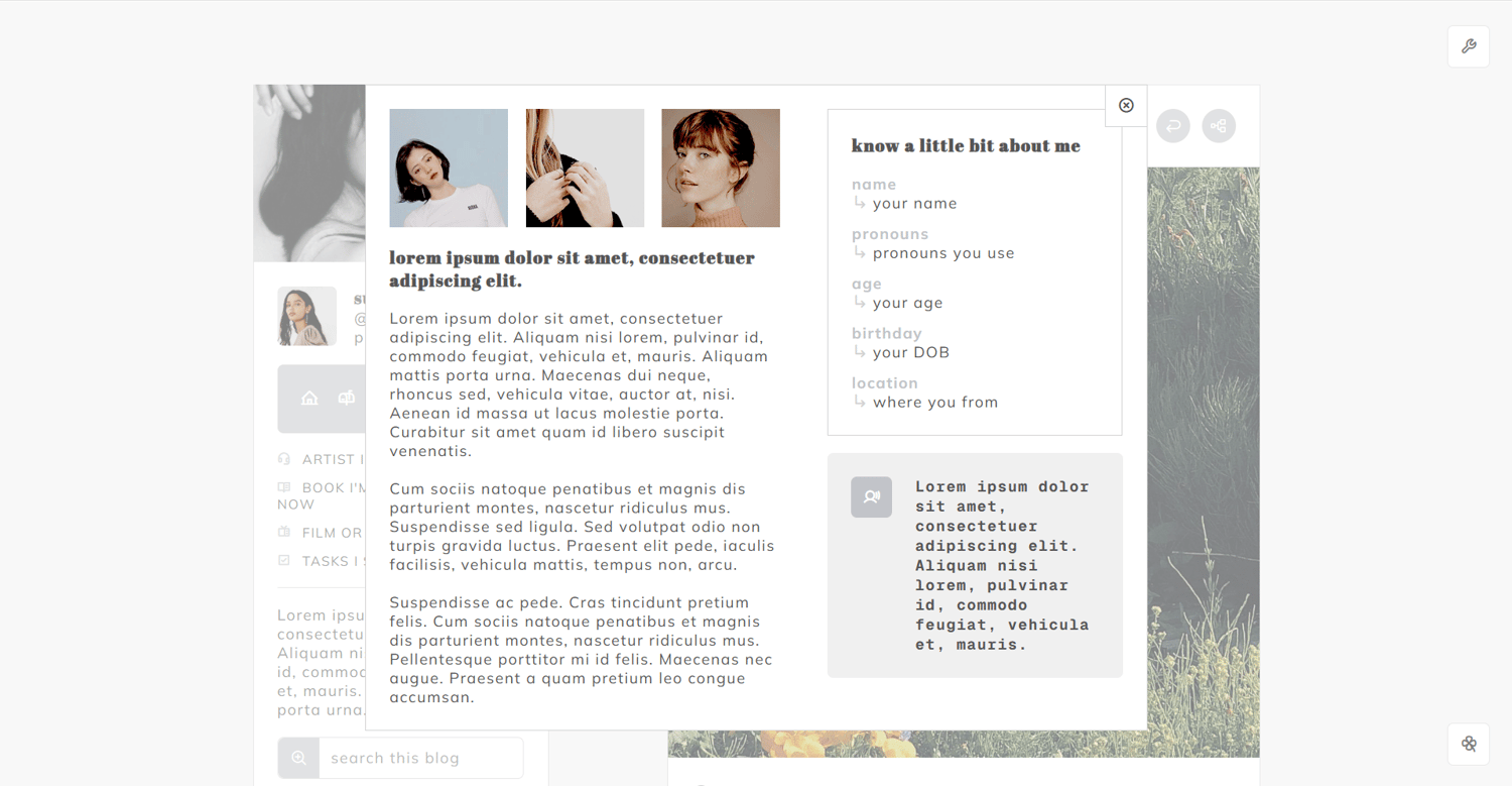 features: 250x150px sidebar image, blog title, five custom links, wid section, search bar, three 100x100px about icon images**, about section**, about info section**, about quote section**, 450px to 540px text posts