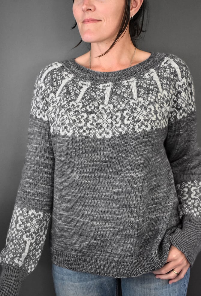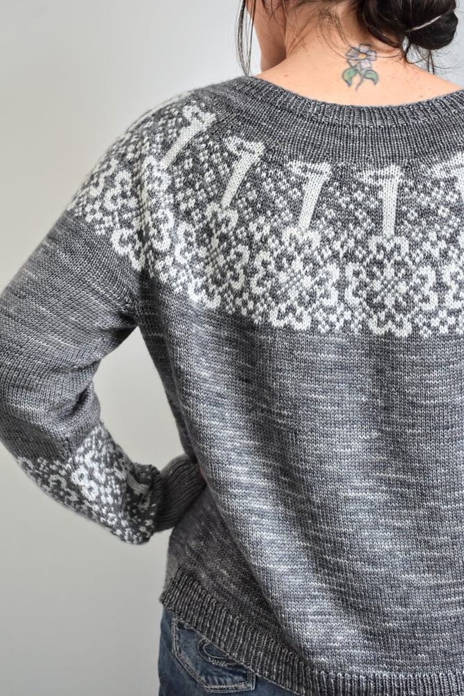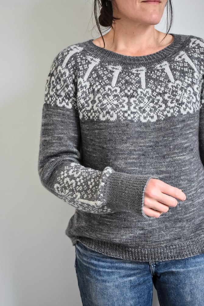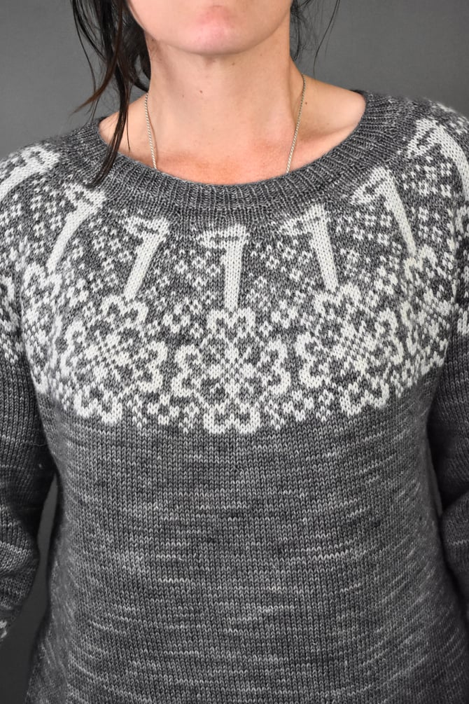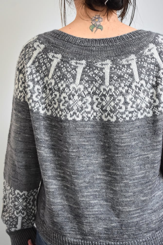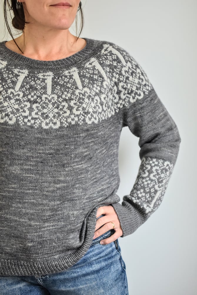 The Keys is a circular yoke worked top down. After the stranded colourwork yoke is worked in the round, stitches are divided for body and sleeves, underarm stitches are cast on, and the lower body is worked in the round to the hem. Sleeves are worked in the round down to the cuffs, where more stranded colourwork is worked just before the cuff ribbing.