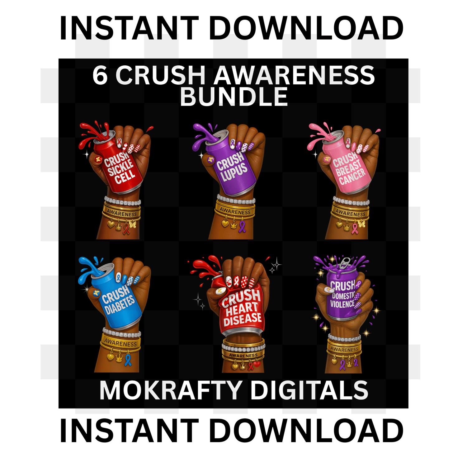 Create bold, empowering merch with this Awareness Bundle! Each design features a powerful fist crushing a can, raising awareness for Sickle Cell, Lupus, Heart Disease, Domestic Violence, Diabetes, and Breast Cancer.
