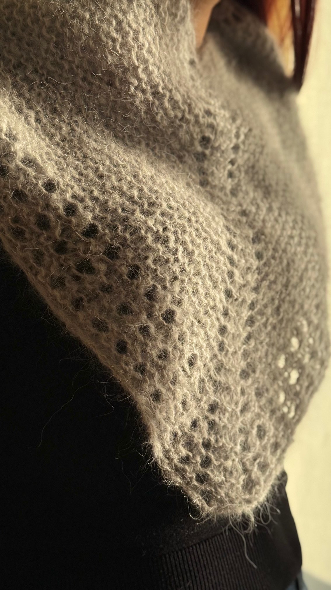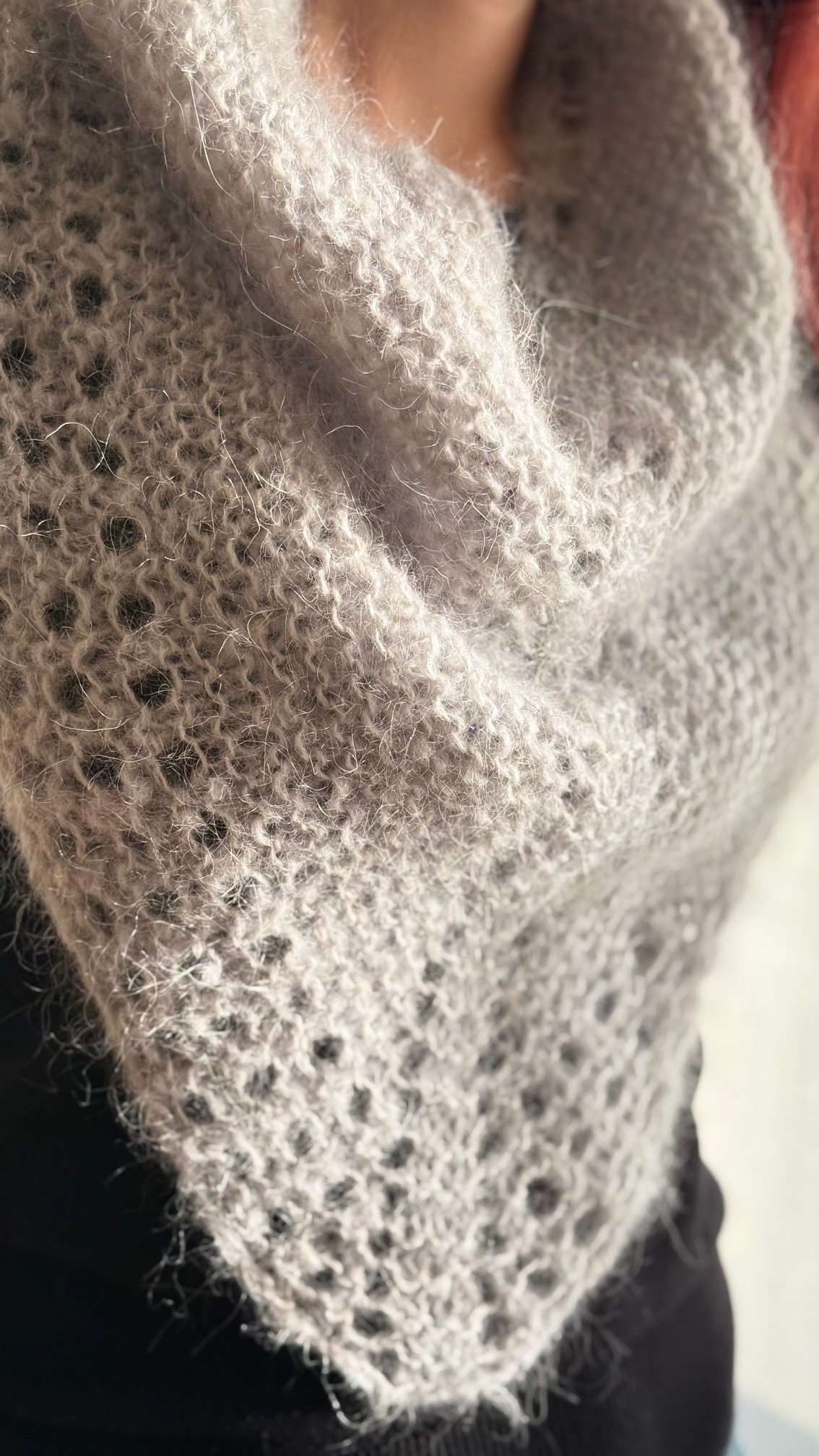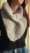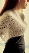 Worked with just one ball of DK-weight mohair and 6.5 mm (US 10 ½) needles, it can be completed in just a few hours. The construction begins like a traditional triangular shawl, with increases along the edges and at the center on right-side rows, and edge increases only on wrong-side rows. Once you reach the required number of stitches for the neck circumference, the piece is joined to work in the round, and increases are then made only at the center on alternating rounds.