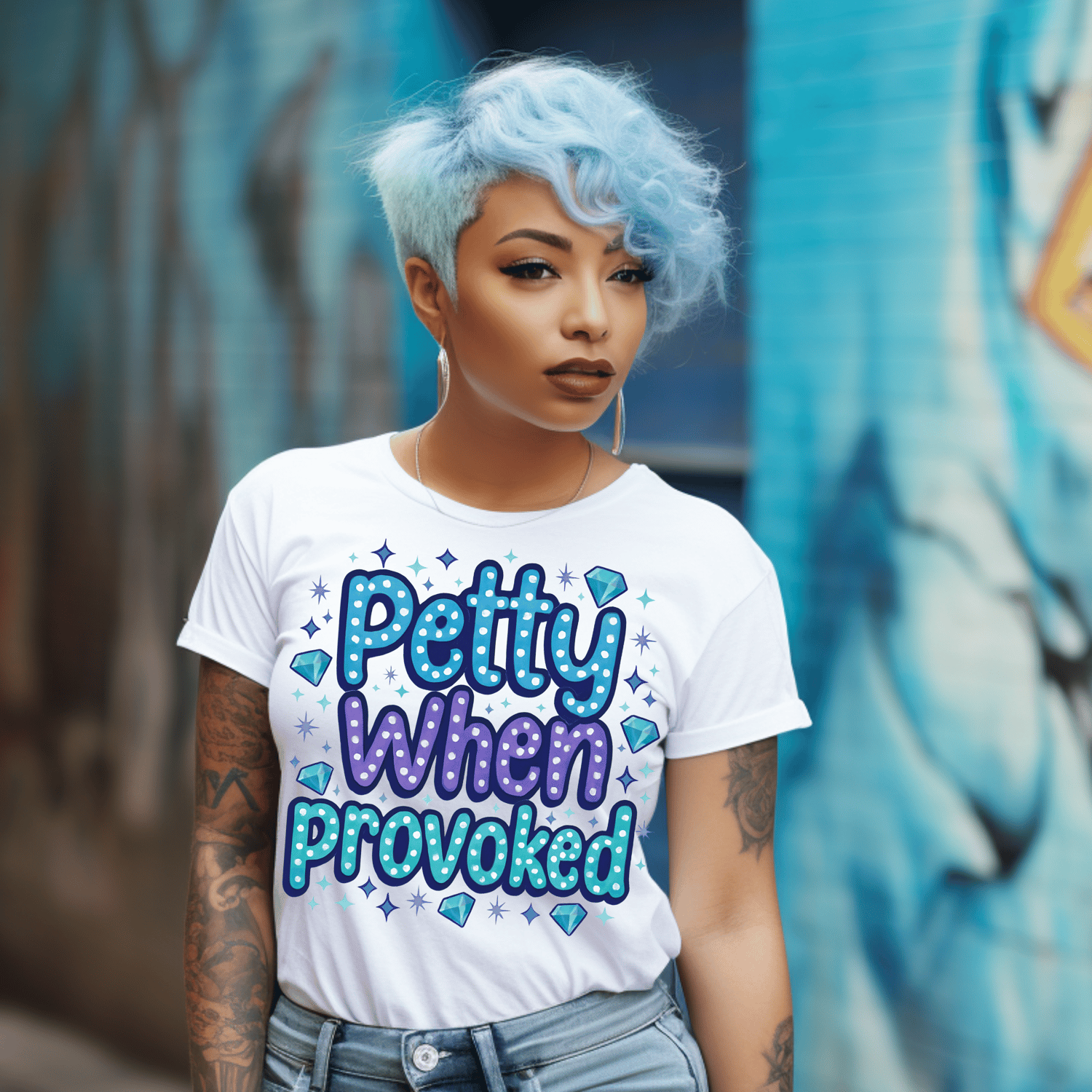 This bold and sassy “Petty When Provoked” design is perfect for those who keep it cute—until it’s time to clap back. With a playful glitter-style finish, this design adds sparkle to any shirt, tumbler, or bag. Perfect for sublimation projects that make a statement!