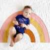 Make a unique rainbow baby quilt and learn how to sew curves with this beginner friendly curve sewing quilt pattern. This bold rainbow pattern is a quick make that makes a beautiful addition to a nursery or a gift to a loved one. The Retro Rainbow pattern makes a four arc rainbow in a baby size quilt that finishes at 42" x 52".