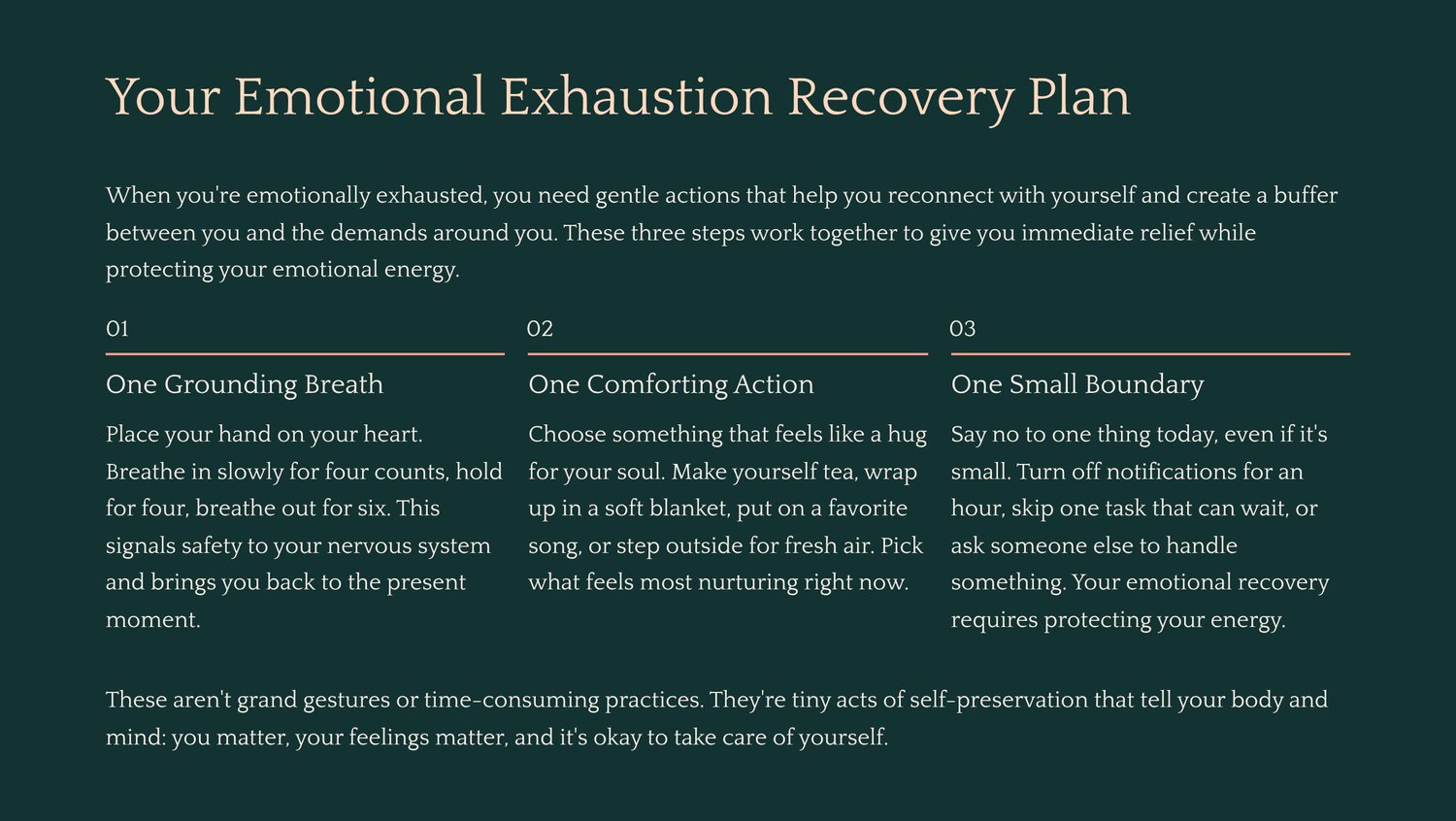 Each section explains what that type of burnout feels like, why it happens, and the three tiny steps that help you recover.