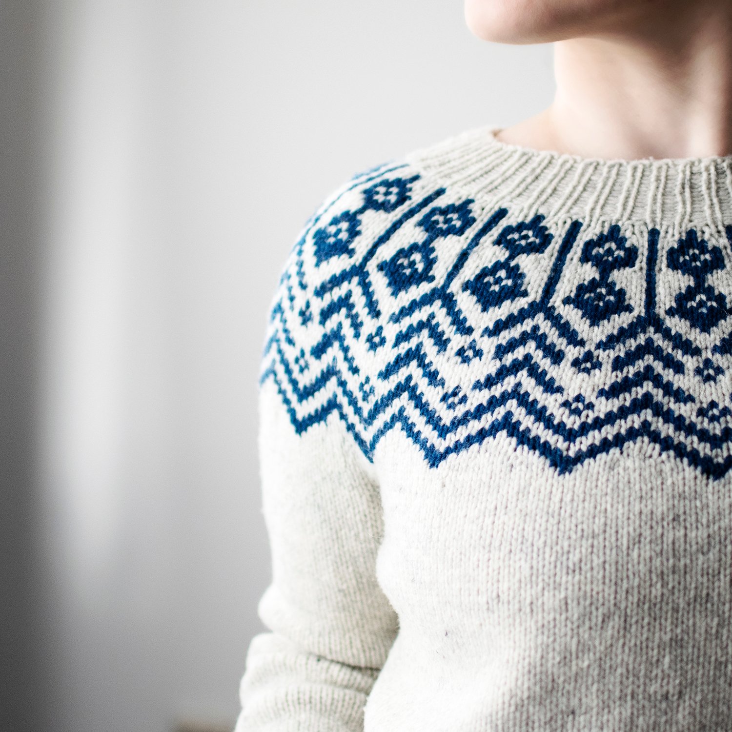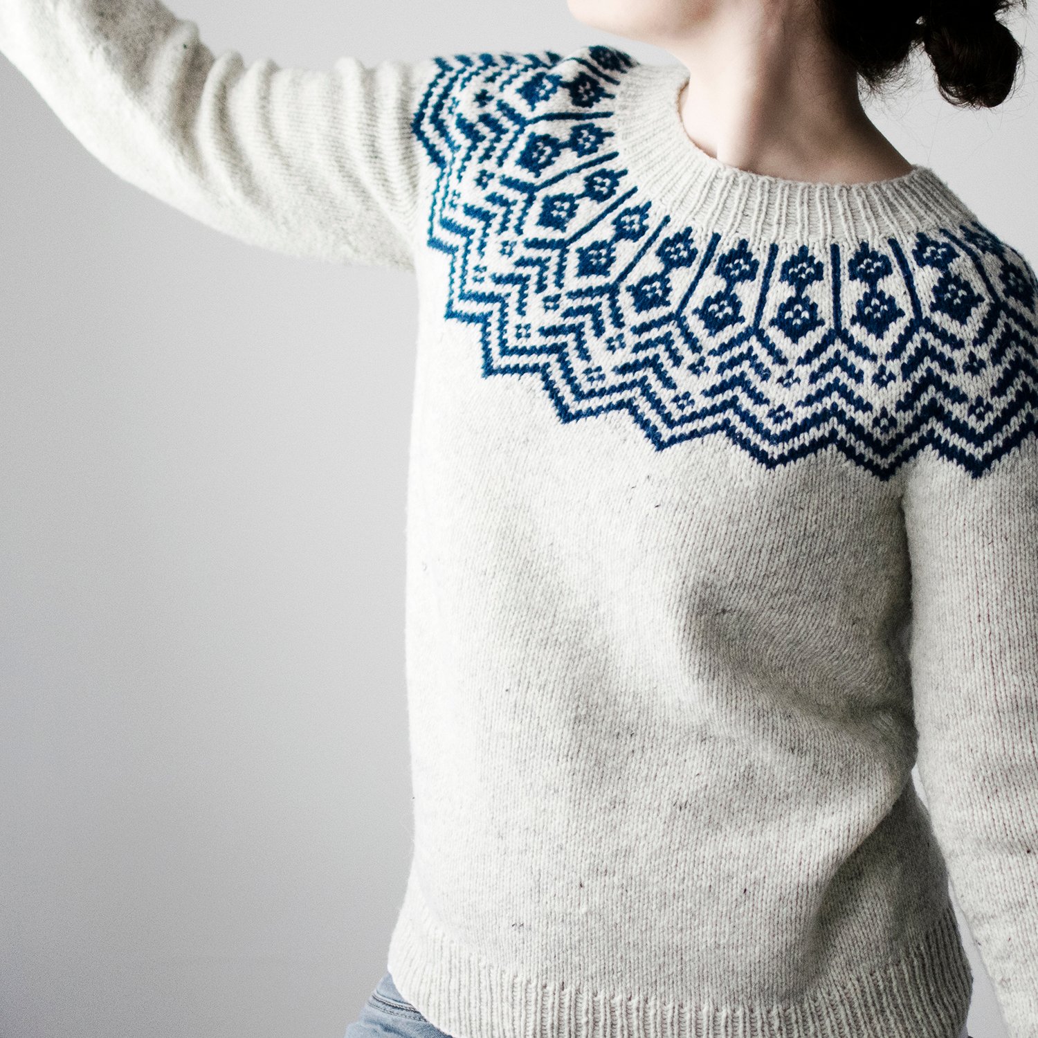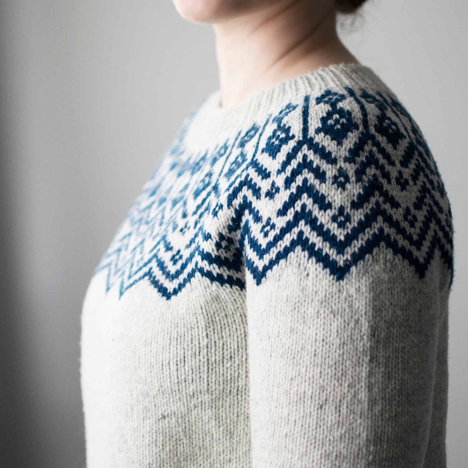The Pullover is worked in the round from the top down, starting with the colorwork yoke. Short rows are used to raise the back and improve the fit at the neckline. Once colorwork and shaping are complete, body and sleeves are separated, and finished in the round.