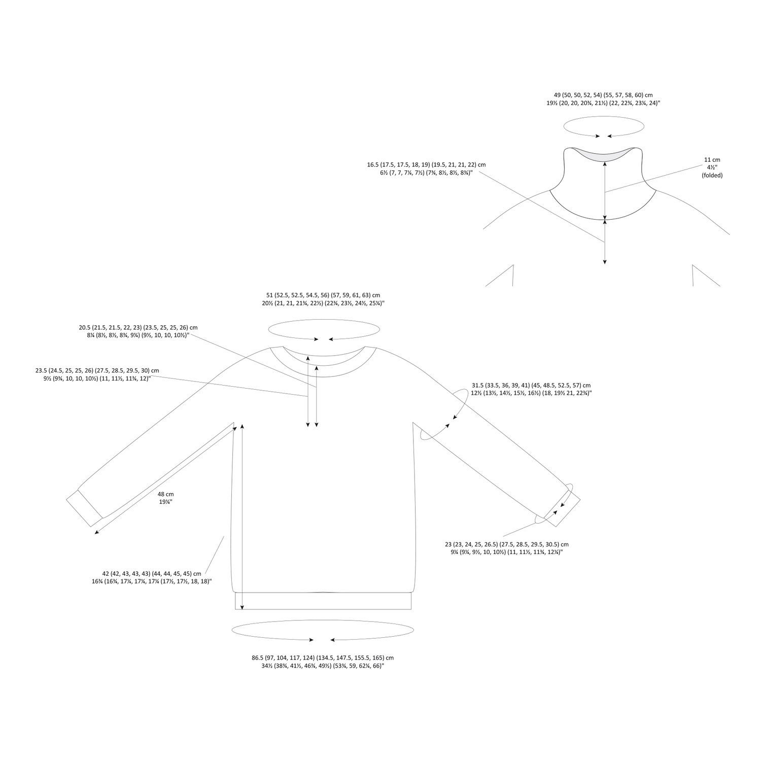 I recommend choosing a size with 5-15 cm/2-6β positive ease to get a comfortable fit. Sample is size 3, worn with approx. 12.5 cm/5β positive ease on a 91.5/36Β½β chest.