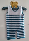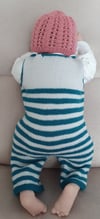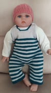 These cute, striped baby overalls, button at the shoulders. Worked in 4ply merino wool, they are soft and cosy, and very comfortable for baby to wear.